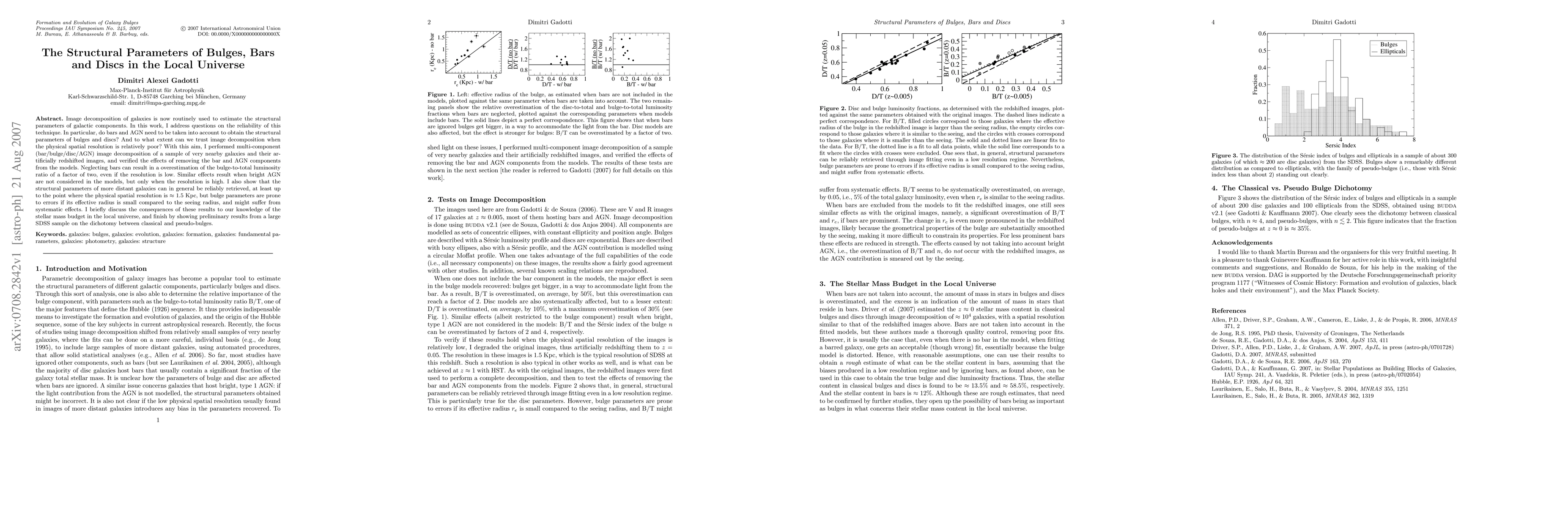Image decomposition of galaxies is now routinely used to estimate the structural parameters of galactic components. In this work, I address questions on the reliability of this technique. In particular, do bars and AGN need to be taken into account to obtain the structural parameters of bulges and discs? And to what extent can we trust image decomposition when the physical spatial resolution is relatively poor? With this aim, I performed multi-component (bar/bulge/disc/AGN) image decomposition of a sample of very nearby galaxies and their artificially redshifted images, and verified the effects of removing the bar and AGN components from the models. Neglecting bars can result in a overestimation of the bulge-to-total luminosity ratio of a factor of two, even if the resolution is low. Similar effects result when bright AGN are not considered in the models, but only when the resolution is high. I also show that the structural parameters of more distant galaxies can in general be reliably retrieved, at least up to the point where the physical spatial resolution is about 1.5 Kpc, but bulge parameters are prone to errors if its effective radius is small compared to the seeing radius, and might suffer from systematic effects. I briefly discuss the consequences of these results to our knowledge of the stellar mass budget in the local universe, and finish by showing preliminary results from a large SDSS sample on the dichotomy between classical and pseudo-bulges.