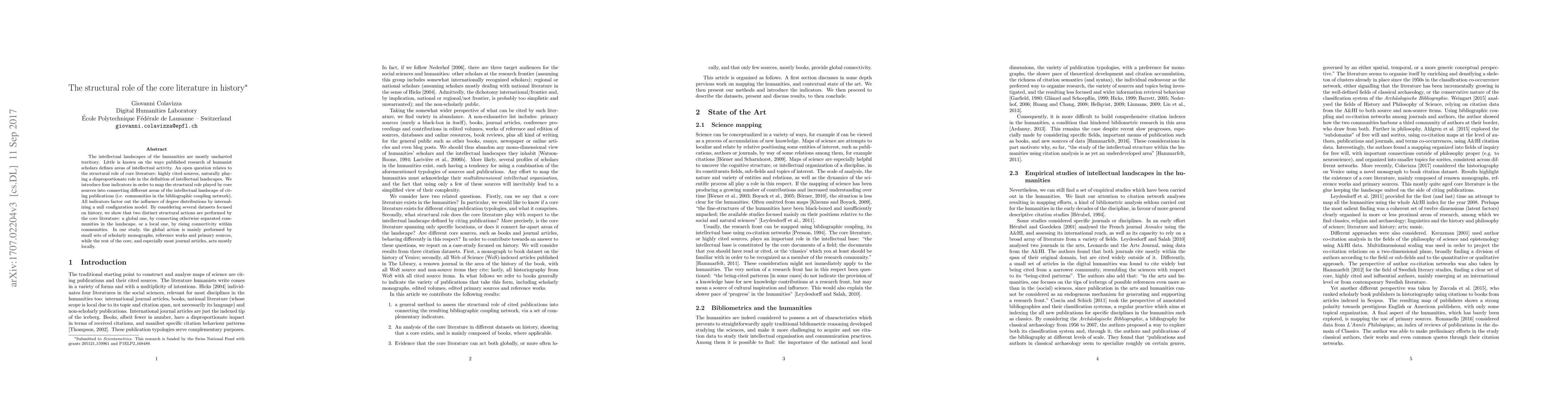 The intellectual landscapes of the humanities are mostly uncharted territory. Little is known on the ways published research of humanist scholars defines areas of intellectual activity. An open question relates to the structural role of core literature: highly cited sources, naturally playing a disproportionate role in the definition of intellectual landscapes. We introduce four indicators in order to map the structural role played by core sources into connecting different areas of the intellectual landscape of citing publications (i.e. communities in the bibliographic coupling network). All indicators factor out the influence of degree distributions by internalizing a null configuration model. By considering several datasets focused on history, we show that two distinct structural actions are performed by the core literature: a global one, by connecting otherwise separated communities in the landscape, or a local one, by rising connectivity within communities. In our study, the global action is mainly performed by small sets of scholarly monographs, reference works and primary sources, while the rest of the core, and especially most journal articles, acts mostly locally.