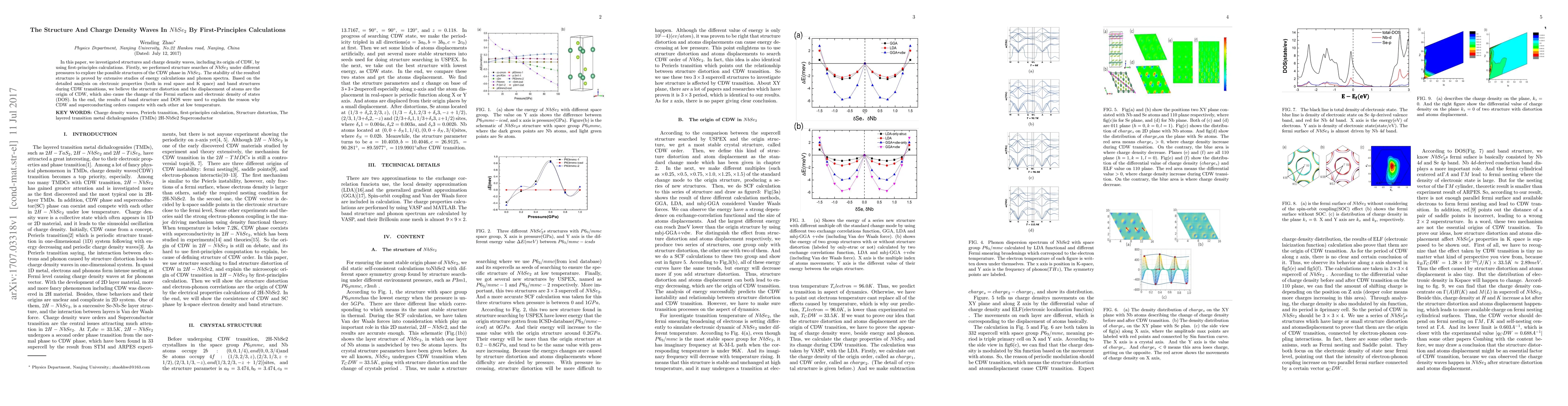 This paper uses first-principles calculations to explore the structures and charge density waves (CDW) in NbSe_2, identifying structural distortions and atomic displacements as the origin of CDW. The study reveals the competition between CDW and superconducting orders at low temperatures through detailed analysis of electronic properties and band structure.