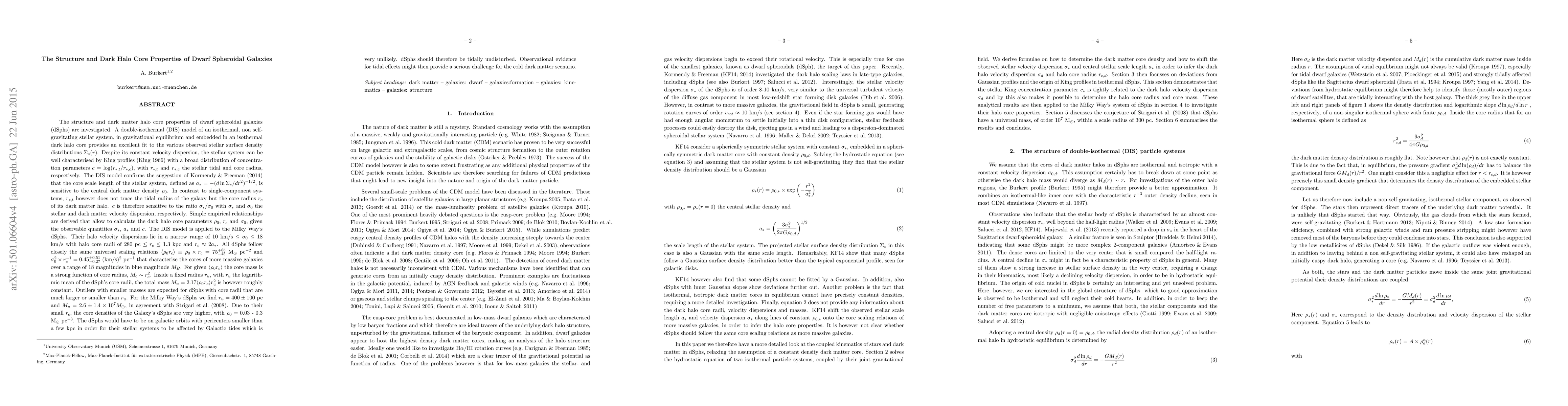 The structure and dark matter halo core properties of dwarf spheroidal galaxies (dSphs) are investigated. A double-isothermal model of an isothermal stellar system, embedded in an isothermal dark halo core provides an excellent fit to the various observed stellar surface density distributions. The stellar system can be well characterised by King profiles with a broad distribution of concentration parameters c. The core scale length of the stellar system a_* is sensitive to the central dark matter density rho_0. In contrast to single-component systems, the cut-off radius of the stellar system, rs_t, however does not trace the tidal radius but the core radius r_c of its dark matter halo. c is therefore sensitive to the ratio of the stellar to the dark matter velocity dispersion, sigma_*/sigma_0. Simple empirical relationships are derived that allow to calculate the dark halo core parameters rho_0, r_c and sigma_0, given the observable quantities sigma_*, a_* and c. The DIS model is applied to the Milky Way's dSphs. Their halo velocity dispersions lie in a narrow range of 10km/s <= sigma_0 <= 18km/s with halo core radii of 280pc <= r_c <= 1.3kpc and r_c=2a_*. All dSphs follow closely the same universal dark halo core scaling relation rho_0*r_c=75 Msolar/pc^2 that characterises the cores of more massive galaxies over several orders of magnitude in mass. The dark matter core mass is a strong function of core radius. Inside a fixed radius r_u, with r_u the logarithmic mean of the dSph's core radii, the total enclosed mass M_u is however roughly constant, although outliers should exist. For our dSphs we find r_u=400pc and M_u=2.6*10^7 Msolar. The core densities of the Galaxy's dSphs are very high, with rho_0=0.2 Msolar/pc^3. They should therefore be tidally undisturbed. Observational evidence for tidal effects might then provide a serious challenge for the cold dark matter scenario.
