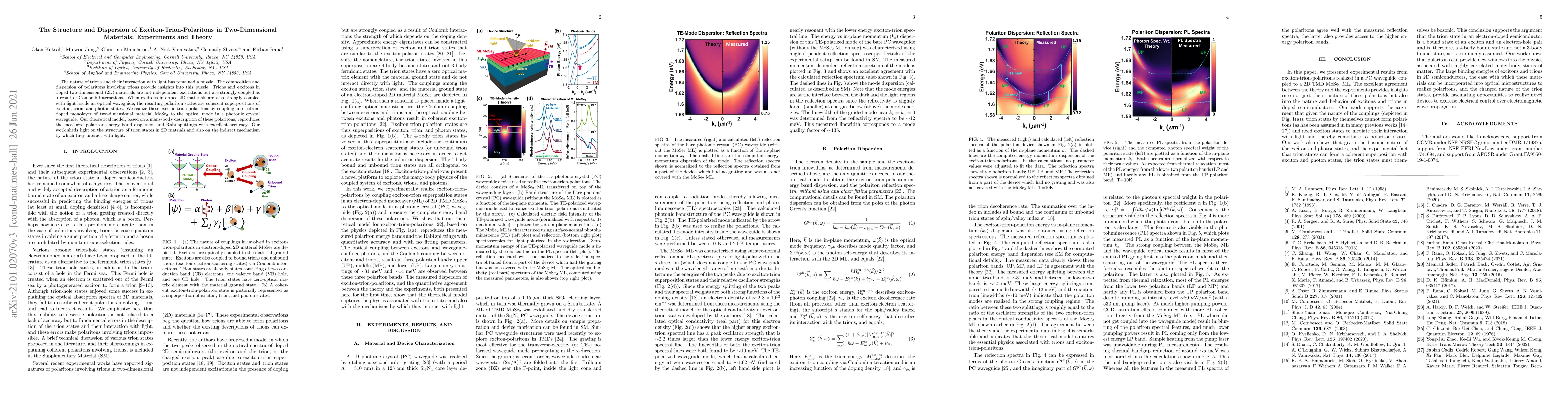 The nature of trions and their interaction with light has remained a puzzle. The composition and dispersion of polaritons involving trions provide insights into this puzzle. Trions and excitons in doped two-dimensional (2D) materials are not independent excitations but are strongly coupled as a result of Coulomb interactions. When excitons in doped 2D materials are also strongly coupled with light inside an optical waveguide, the resulting polariton states are coherent superpositions of exciton, trion, and photon states. We realize these exciton-trion-polaritons by coupling an electron-doped monolayer of two-dimensional material MoSe2 to the optical mode in a photonic crystal waveguide. Our theoretical model, based on a many-body description of these polaritons, reproduces the measured polariton energy band dispersion and Rabi splittings with excellent accuracy. Our work sheds light on the structure of trion states in 2D matrials and also on the indirect mechanism by which they interact with light.