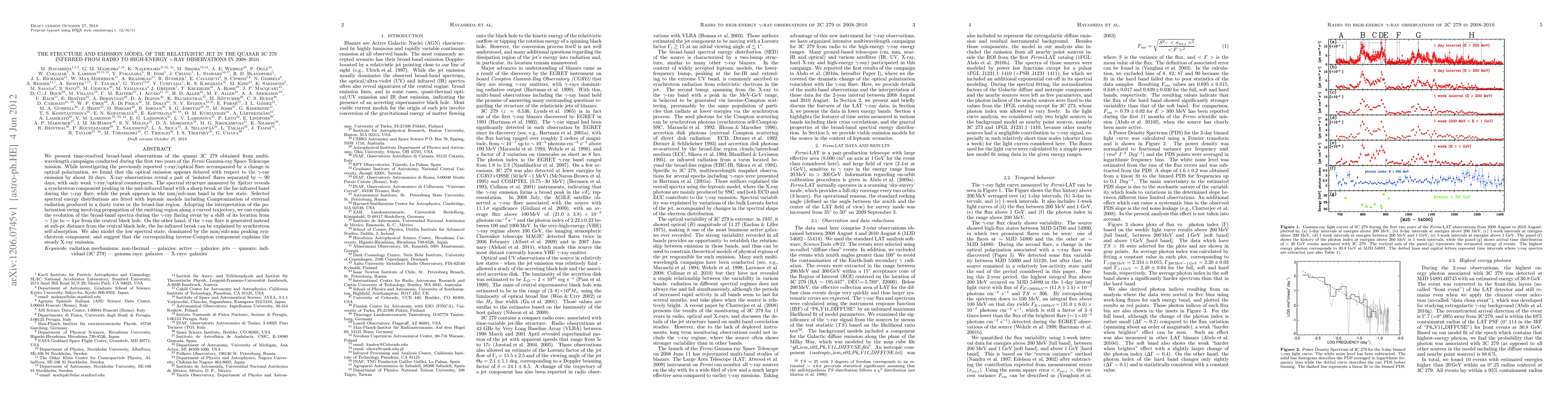 We present time-resolved broad-band observations of the quasar 3C 279 obtained from multi-wavelength campaigns conducted during the first two years of the Fermi Gamma-ray Space Telescope mission. While investigating the previously reported gamma-ray/optical flare accompanied by a change in optical polarization, we found that the optical emission appears delayed with respect to the gamma-ray emission by about 10 days. X-ray observations reveal a pair of `isolated' flares separated by ~90 days, with only weak gamma-ray/optical counterparts. The spectral structure measured by Spitzer reveals a synchrotron component peaking in the mid-infrared band with a sharp break at the far-infrared band during the gamma-ray flare, while the peak appears in the mm/sub-mm band in the low state. Selected spectral energy distributions are fitted with leptonic models including Comptonization of external radiation produced in a dusty torus or the broad-line region. Adopting the interpretation of the polarization swing involving propagation of the emitting region along a curved trajectory, we can explain the evolution of the broad-band spectra during the gamma-ray flaring event by a shift of its location from ~ 1 pc to ~ 4 pc from the central black hole. On the other hand, if the gamma-ray flare is generated instead at sub-pc distance from the central black hole, the far-infrared break can be explained by synchrotron self-absorption. We also model the low spectral state, dominated by the mm/sub-mm peaking synchrotron component, and suggest that the corresponding inverse-Compton component explains the steady X-ray emission.