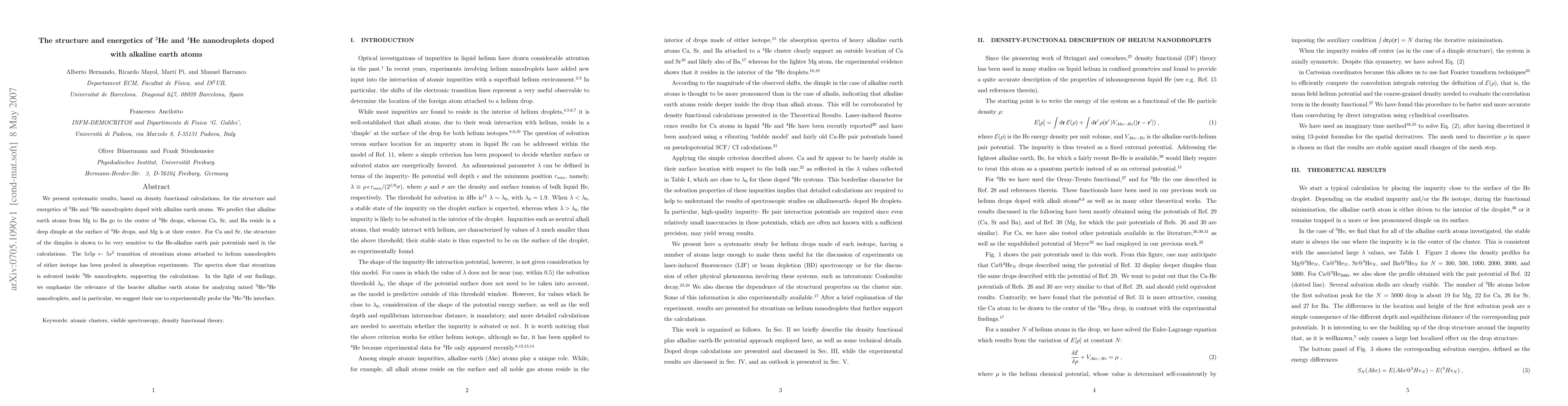 This paper uses density functional calculations to study the structure and energetics of $^3$He and $^4$He nanodroplets doped with alkaline earth atoms, finding that heavier atoms tend to reside at the center of $^3$He drops and in surface dimples of $^4$He drops. Experimental absorption spectra of strontium in helium nanodroplets support these predictions.