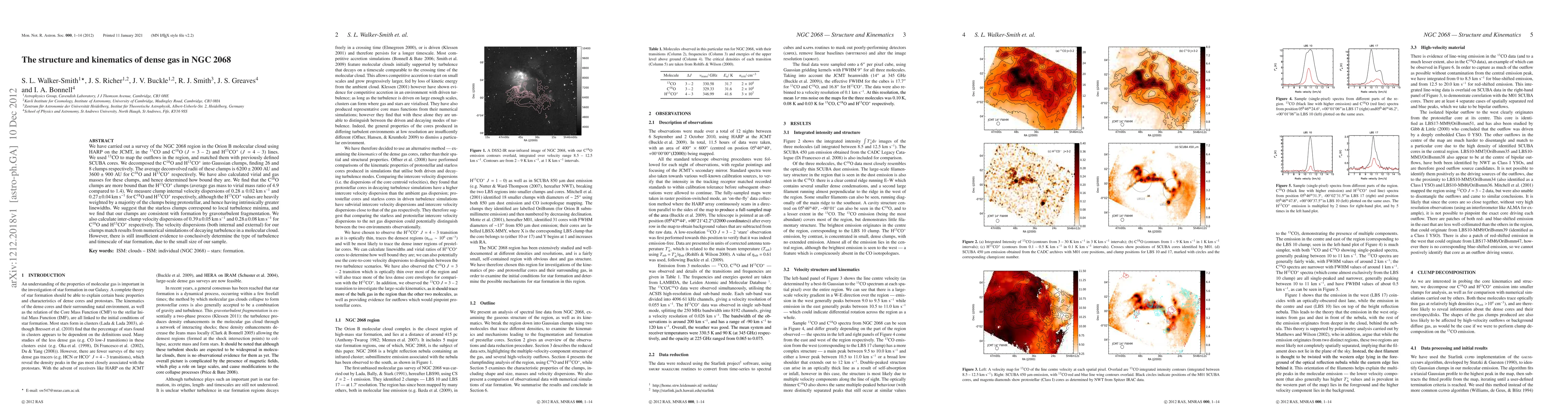We have carried out a survey of the NGC 2068 region in the Orion B molecular cloud using HARP on the JCMT, in the 13CO and C18O (J = 3-2) and H13CO+ (J = 4-3) lines. We used 13CO to map the outflows in the region, and matched them with previously defined SCUBA cores. We decomposed the C18O and H13CO+ into Gaussian clumps, finding 26 and 8 clumps respectively. The average deconvolved radii of these clumps is 6200 +/- 2000 AU and 3600 +/- 900 AU for C18O and H13CO+ respectively. We have also calculated virial and gas masses for these clumps, and hence determined how bound they are. We find that the C18O clumps are more bound than the H13CO+ clumps (average gas mass to virial mass ratio of 4.9 compared to 1.4). We measure clump internal velocity dispersions of 0.28 +/- 0.02 kms-1 and 0.27 +/- 0.04 kms-1 for C18O and H13CO+ respectively, although the H13CO+ values are heavily weighted by a majority of the clumps being protostellar, and hence having intrinsically greater linewidths. We suggest that the starless clumps correspond to local turbulence minima, and we find that our clumps are consistent with formation by gravoturbulent fragmentation. We also calculate inter-clump velocity dispersions of 0.39 +/- 0.05 kms-1 and 0.28 +/- 0.08 kms-1 for C18O and H13CO+ respectively. The velocity dispersions (both internal and external) for our clumps match results from numerical simulations of decaying turbulence in a molecular cloud. However, there is still insufficient evidence to conclusively determine the type of turbulence and timescale of star formation, due to the small size of our sample.