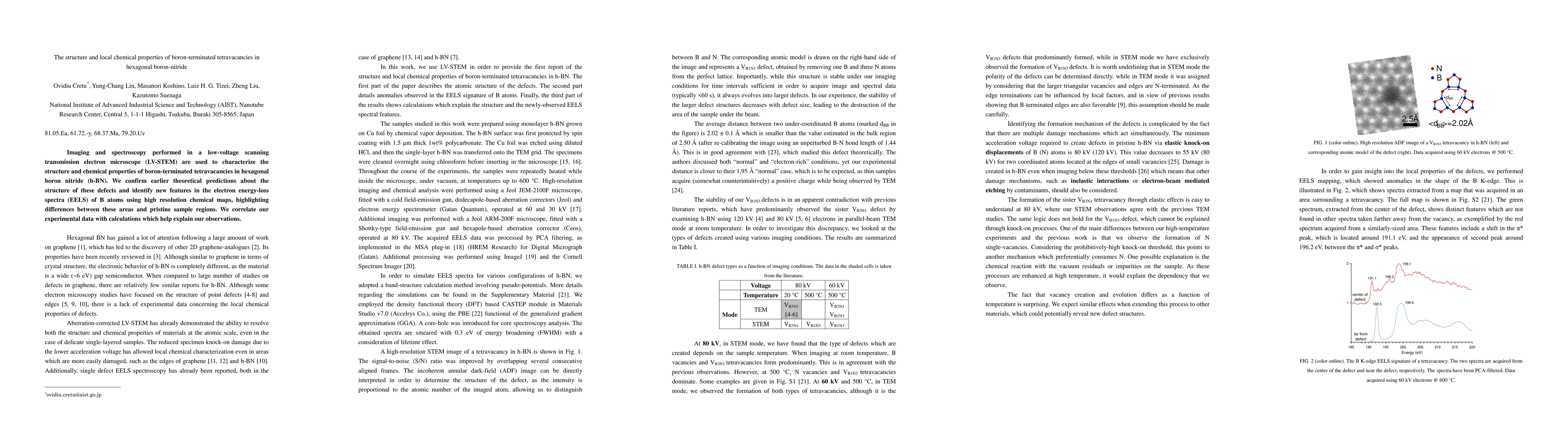 Imaging and spectroscopy performed in a low-voltage scanning transmission electron microscope (LV-STEM) are used to characterize the structure and chemical properties of boron-terminated tetravacancies in hexagonal boron nitride (h-BN). We confirm earlier theoretical predictions about the structure of these defects and identify new features in the electron energy-loss spectra (EELS) of B atoms using high resolution chemical maps, highlighting differences between these areas and pristine sample regions. We correlate our experimental data with calculations which help explain our observations.