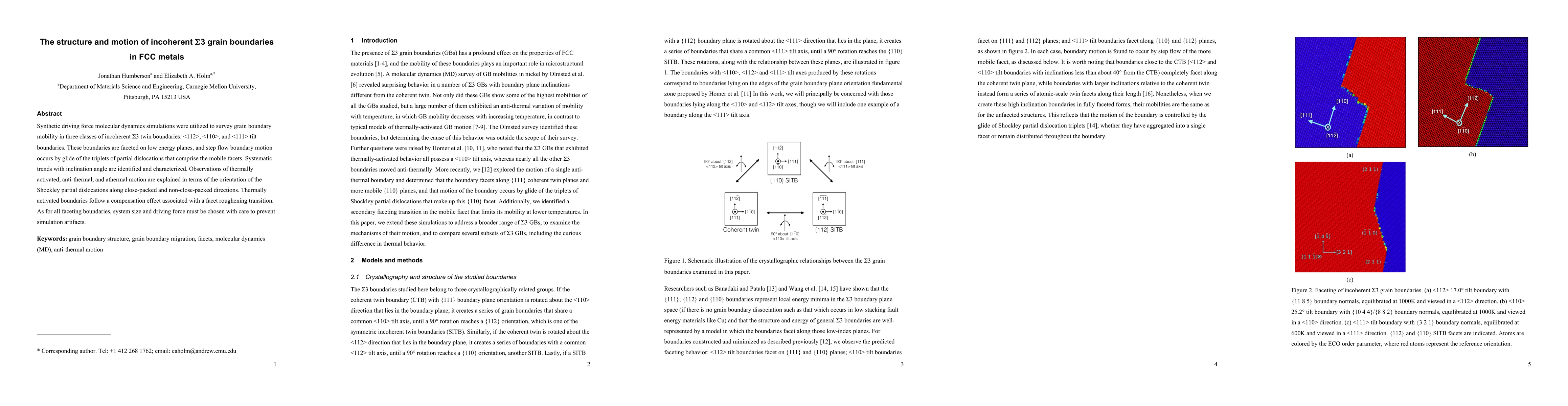 Researchers used simulations to study the movement of specific grain boundaries in metals, finding that their motion is influenced by the orientation of dislocations within them. They also discovered patterns in how these boundaries move at different temperatures.