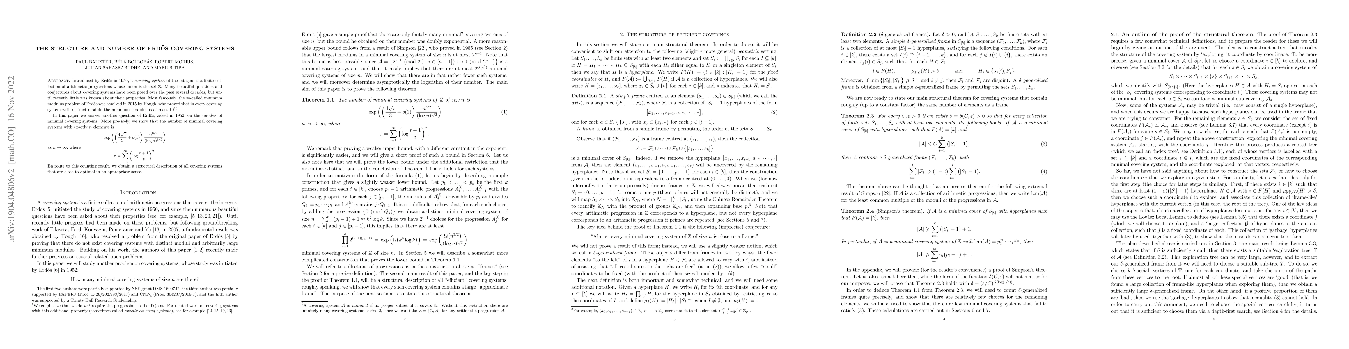 This paper addresses Erdős' 1952 question on the number of minimal covering systems, showing that the count grows asymptotically as \[\exp\left(\left(\frac{4\sqrt{\tau}}{3} + o(1)\right) \frac{n^{3/2}}{(\log n)^{1/2}}\right)\] for large $n$, where $\tau$ is a specific sum involving logarithms. It also provides a structural description of near-optimal covering systems.
