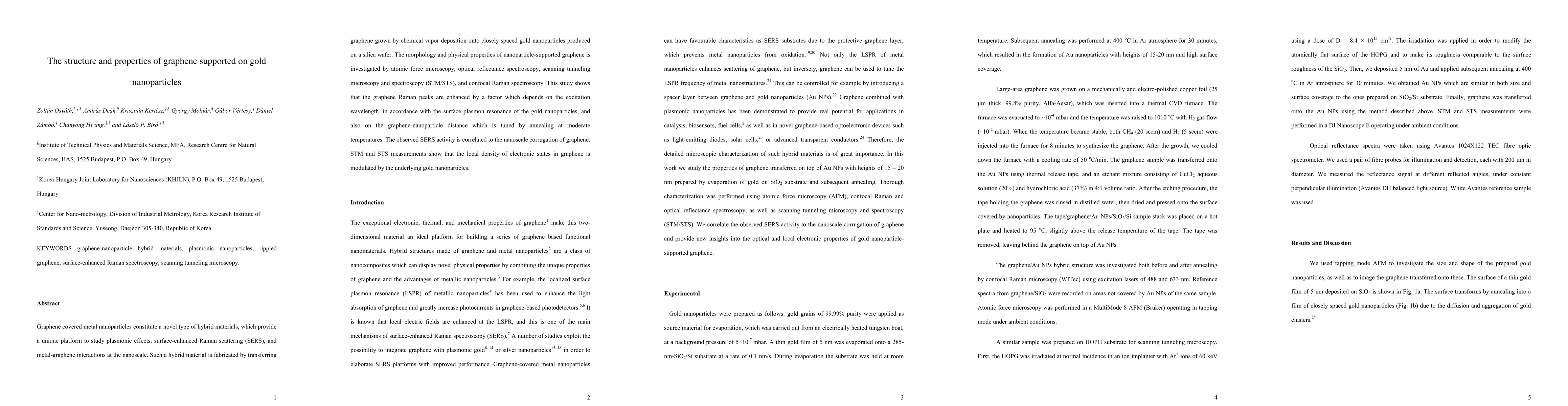 This study investigates the structure and properties of graphene supported on gold nanoparticles, revealing enhanced Raman peaks due to surface plasmon resonance and SERS activity, modulated by the graphene-nanoparticle distance and nanoscale corrugation, as shown by various spectroscopic techniques.
