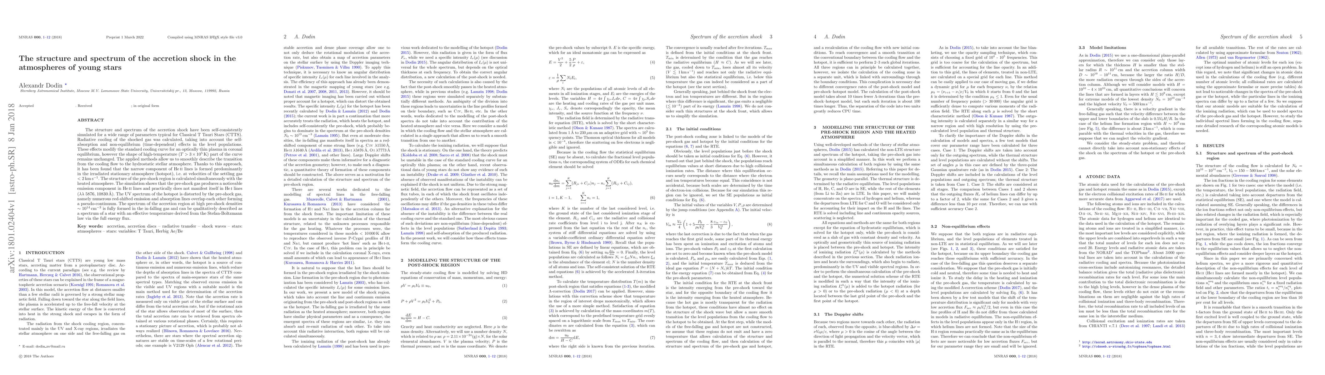 The structure and spectrum of the accretion shock have been self-consistently simulated for a wide range of parameters typical for Classical T Tauri Stars (CTTS). Radiative cooling of the shocked gas was calculated, taking into account the self-absorption and non-equilibrium (time-dependent) effects in the level populations. These effects modify the standard cooling curve for an optically thin plasma in coronal equilibrium, however the shape of high-temperature ($T>3\times10^5$ K) part of the curve remains unchanged. The applied methods allow us to smoothly describe the transition from the cooling flow to the hydrostatic stellar atmosphere. Thanks to this approach, it has been found that the narrow component of HeII lines is formed predominantly in the irradiated stationary atmosphere (hotspot), i.e. at velocities of the settling gas $<2$ km s$^{-1}$. The structure of the pre-shock region is calculated simultaneously with the heated atmosphere. The simulation shows that the pre-shock gas produces a noticeable emission component in HeII lines and practically does not manifest itself in HeI lines ($\lambda\lambda$ 5876, 10830 {\AA}). The UV spectrum of the hotspot is distorted by the pre-shock gas, namely numerous red-shifted emission and absorption lines overlap each other forming a pseudo-continuum. The spectrum of the accretion region at high pre-shock densities $\sim10^{14}$ cm$^{-3}$ is fully formed in the in-falling gas and can be qualitatively described as a spectrum of a star with an effective temperature derived from the Stefan-Boltzmann law via the full energy flux.