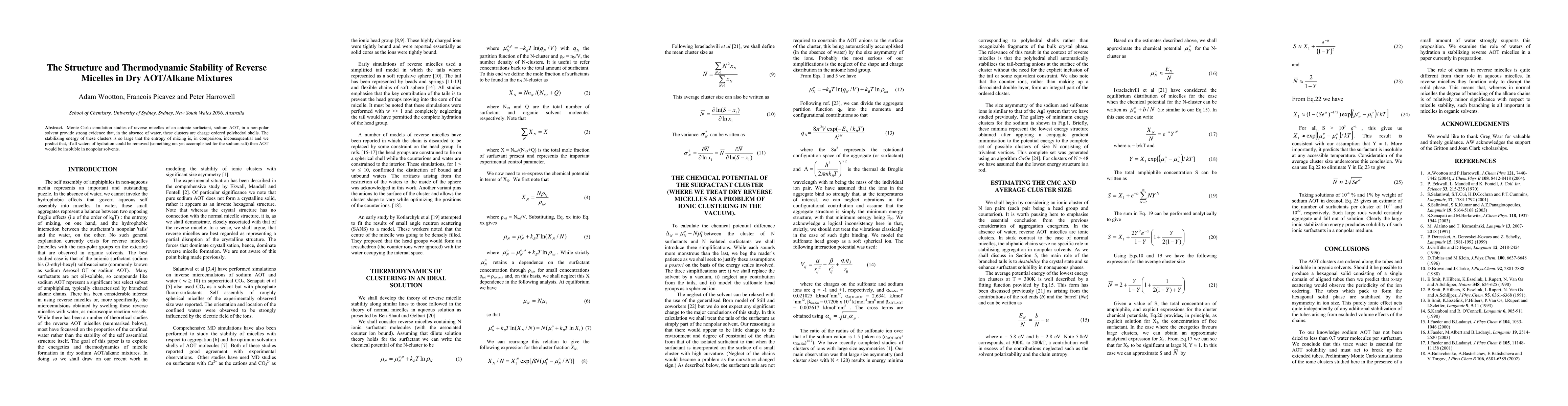 Summary: Monte Carlo simulations reveal that reverse micelles of sodium AOT in dry alkane mixtures form charge-ordered polyhedral shells, demonstrating significant thermodynamic stability due to large stabilizing energy, suggesting AOT would be insoluble in nonpolar solvents if all hydration waters were removed.
