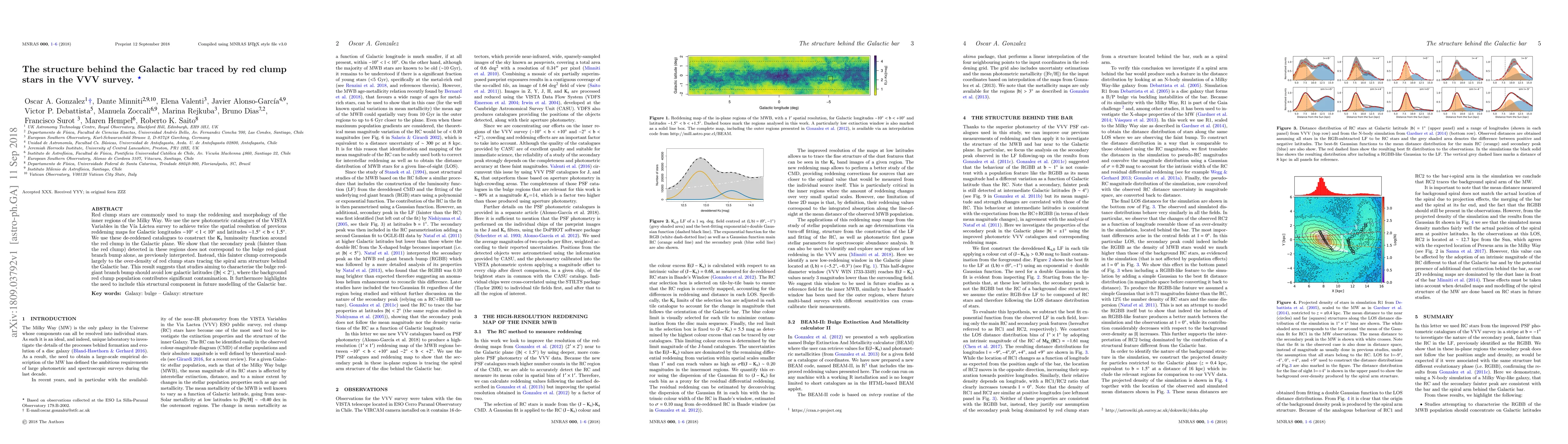 This study uses red clump stars from the VVV survey to map the Galactic bar's structure, revealing a secondary peak in luminosity that traces spiral arm features behind the bar, rather than just the bulge. This finding emphasizes the importance of distinguishing between these components in future Galactic bar models.