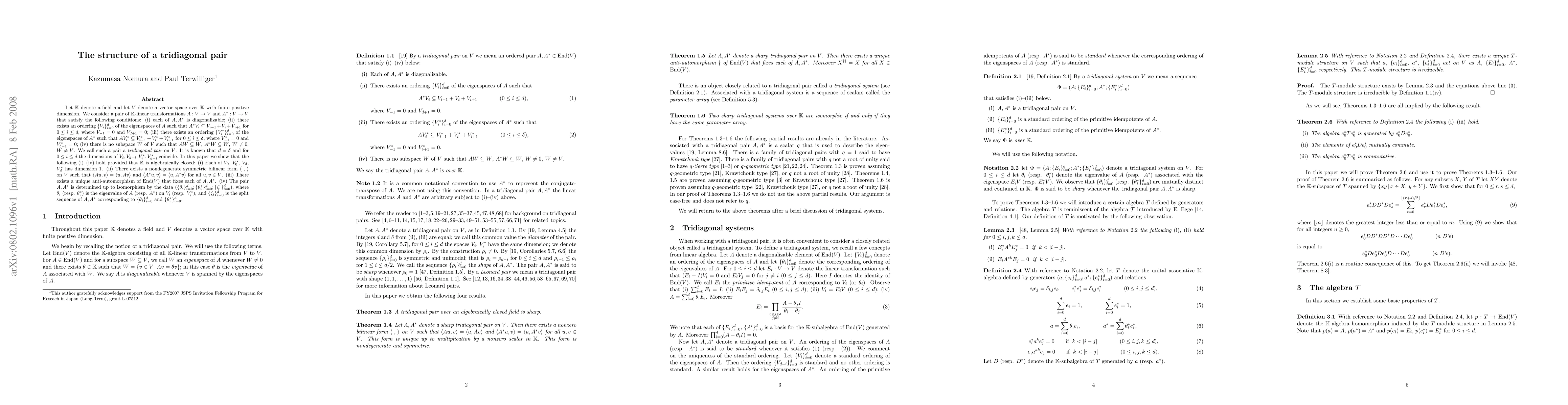 Let $K$ denote a field and let $V$ denote a vector space over $K$ with finite positive dimension. We consider a pair of linear transformations $A:V \to V$ and $A^*:V \to V$ that satisfy the following conditions: (i) each of $A,A^*$ is diagonalizable; (ii) there exists an ordering $\{V_i\}_{i=0}^d$ of the eigenspaces of $A$ such that $A^* V_i \subseteq V_{i-1} + V_i + V_{i+1}$ for $0 \leq i \leq d$, where $V_{-1}=0$ and $V_{d+1}=0$; (iii) there exists an ordering $\{V^*_i\}_{i=0}^\delta$ of the eigenspaces of $A^*$ such that $A V^*_i \subseteq V^*_{i-1} + V^*_i + V^*_{i+1}$ for $0 \leq i \leq \delta$, where $V^*_{-1}=0$ and $V^*_{\delta+1}=0$; (iv)there is no subspace $W$ of $V$ such that $AW \subseteq W$, $A^* W \subseteq W$, $W \neq 0$, $W \neq V$. We call such a pair a tridiagonal pair on $V$. It is known that $d=\delta$ and for $0 \leq i \leq d$ the dimensions of $V_i, V_{d-i}, V^*_i, V^*_{d-i}$ coincide. In this paper we show that the following (i)--(iv) hold provided that $K$ is algebraically closed: (i) Each of $V_0$, $V^*_0$, $V_d$, $V^*_d$ has dimension 1. (ii) There exists a nondegenerate symmetric bilinear form $(,)$ on $V$ such that $(Au,v)=(u,Av)$ and $(A^*u,v)=(u,A^*v)$ for all $u,v \in V$. (iii) There exists a unique anti-automorphism of $End(V)$ that fixes each of $A,A^*$. (iv) The pair $A,A^*$ is determined up to isomorphism by the data $(\{\th_i\}_{i=0}^d; \{\th^*_i\}_{i=0}^d; \{\zeta_i\}_{i=0}^d)$, where $\th_i$ (resp. $\th^*_i$) is the eigenvalue of $A$ (resp. $A^*$) on $V_i$ (resp. $V^*_i$), and $\{\zeta_i\}_{i=0}^d$ is the split sequence of $A,A^*$ corresponding to $\{\th_i\}_{i=0}^d$ and $\{\th^*_i\}_{i=0}^d$.