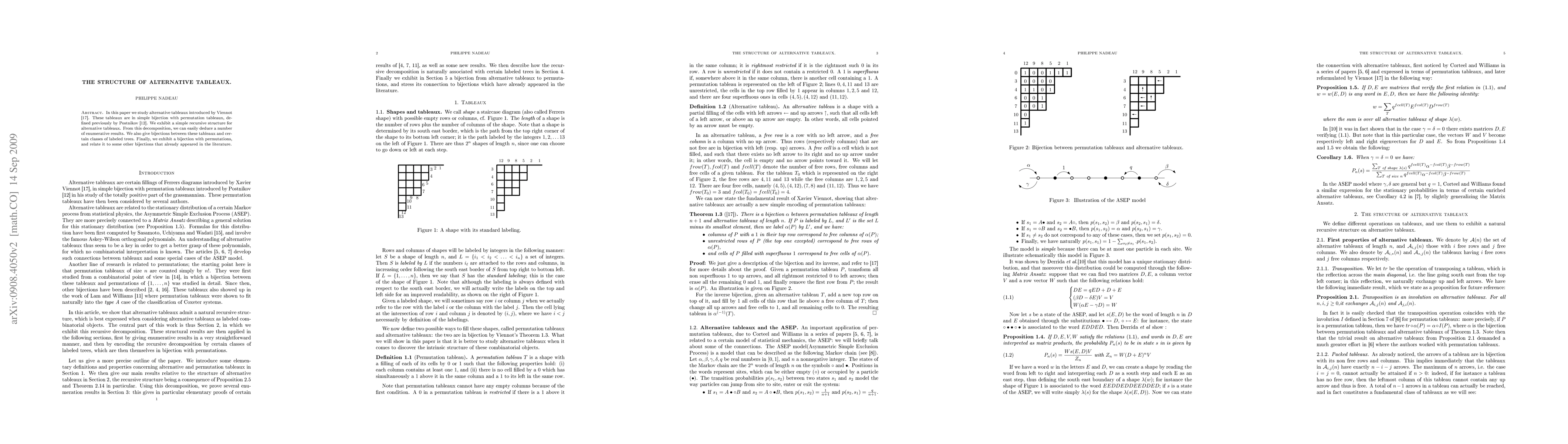 In this paper we study alternative tableaux introduced by Viennot. These tableaux are in simple bijection with permutation tableaux, defined previously by Postnikov . We exhibit a simple recursive structure for alternative tableaux. From this decomposition, we can easily deduce a number of enumerative results. We also give bijections between these tableaux and certain classes of labeled trees. Finally, we exhibit a bijection with permutations, and relate it to some other bijections that already appeared in the literature.