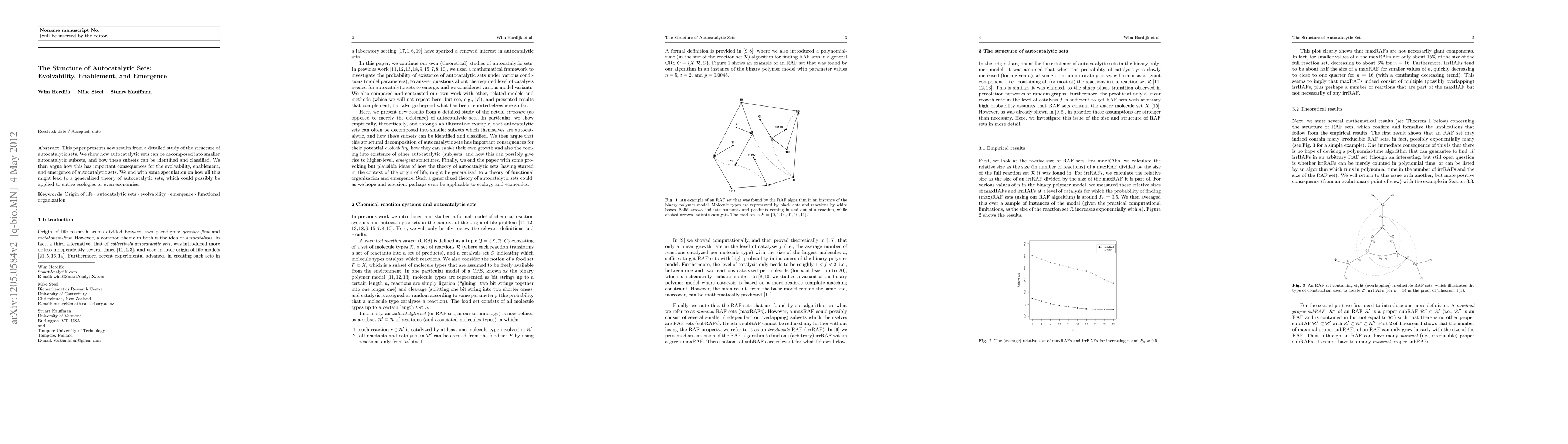 This paper presents new results from a detailed study of the structure of autocatalytic sets. We show how autocatalytic sets can be decomposed into smaller autocatalytic subsets, and how these subsets can be identified and classified. We then argue how this has important consequences for the evolvability, enablement, and emergence of autocatalytic sets. We end with some speculation on how all this might lead to a generalized theory of autocatalytic sets, which could possibly be applied to entire ecologies or even economies.