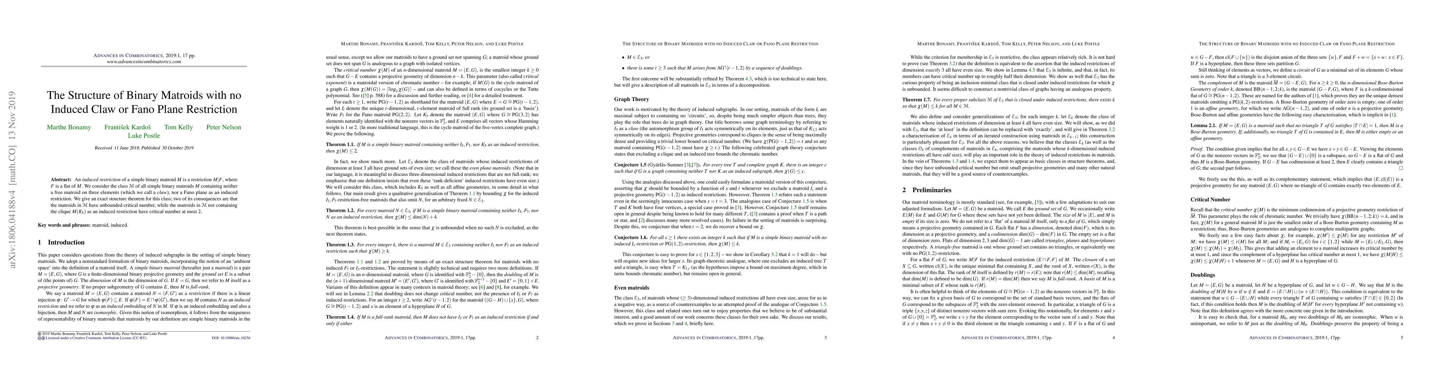 An 'induced restriction' of a simple binary matroid $M$ is a restriction $M|F$, where $F$ is a flat of $M$. We consider the class $\mathcal{M}$ of all simple binary matroids $M$ containing neither a free matroid on three elements (which we call a 'claw'), nor a Fano plane as an induced restriction. We give an exact structure theorem for this class; two of its consequences are that the matroids in $\mathcal{M}$ have unbounded critical number, while the matroids in $\mathcal{M}$ not containing the clique $M(K_5)$ as an induced restriction have critical number at most $2$.