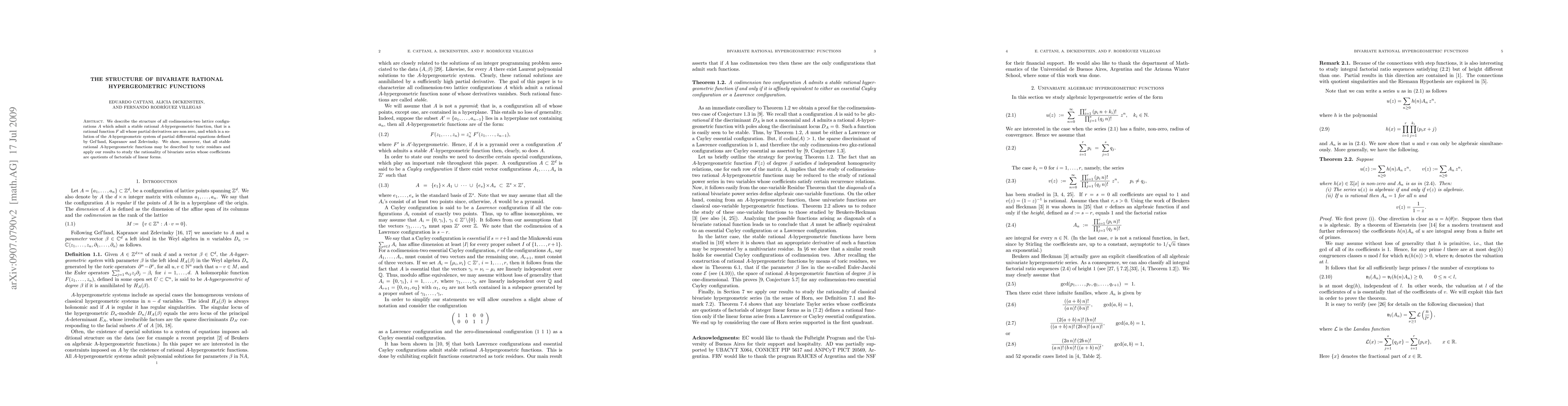 This paper explores the structure of stable rational hypergeometric functions associated with codimension-two lattice configurations $A$, demonstrating that they can be described using toric residues. It also investigates the rationality of bivariate series with coefficients as quotients of factorials of linear forms.
