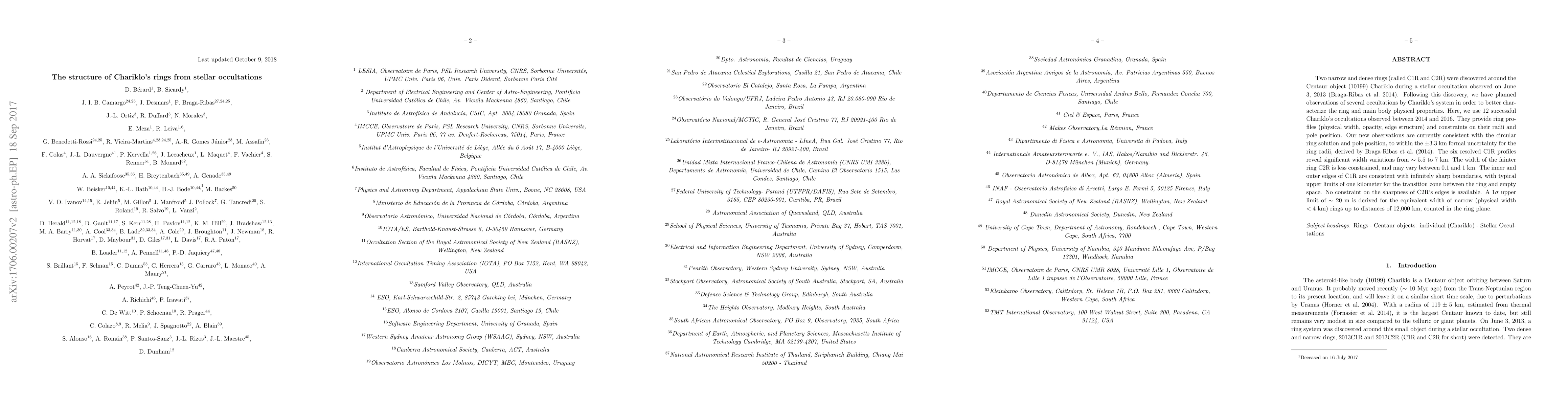 Two narrow and dense rings (called C1R and C2R) were discovered around the Centaur object (10199) Chariklo during a stellar occultation observed on 2013 June 3. Following this discovery, we planned observations of several occultations by Chariklo's system in order to better characterize the physical properties of the ring and main body. Here, we use 12 successful occulations by Chariklo observed between 2014 and 2016. They provide ring profiles (physical width, opacity, edge structure) and constraints on the radii and pole position. Our new observations are currently consistent with the circular ring solution and pole position, to within the $\pm 3.3$ km formal uncertainty for the ring radii derived by Braga-Ribas et al. The six resolved C1R profiles reveal significant width variations from $\sim 5$ to 7.5 km. The width of the fainter ring C2R is less constrained, and may vary between 0.1 and 1 km. The inner and outer edges of C1R are consistent with infinitely sharp boundaries, with typical upper limits of one kilometer for the transition zone between the ring and empty space. No constraint on the sharpness of C2R's edges is available. A 1$\sigma$ upper limit of $\sim 20$ m is derived for the equivalent width of narrow (physical width <4 km) rings up to distances of 12,000 km, counted in the ring plane.