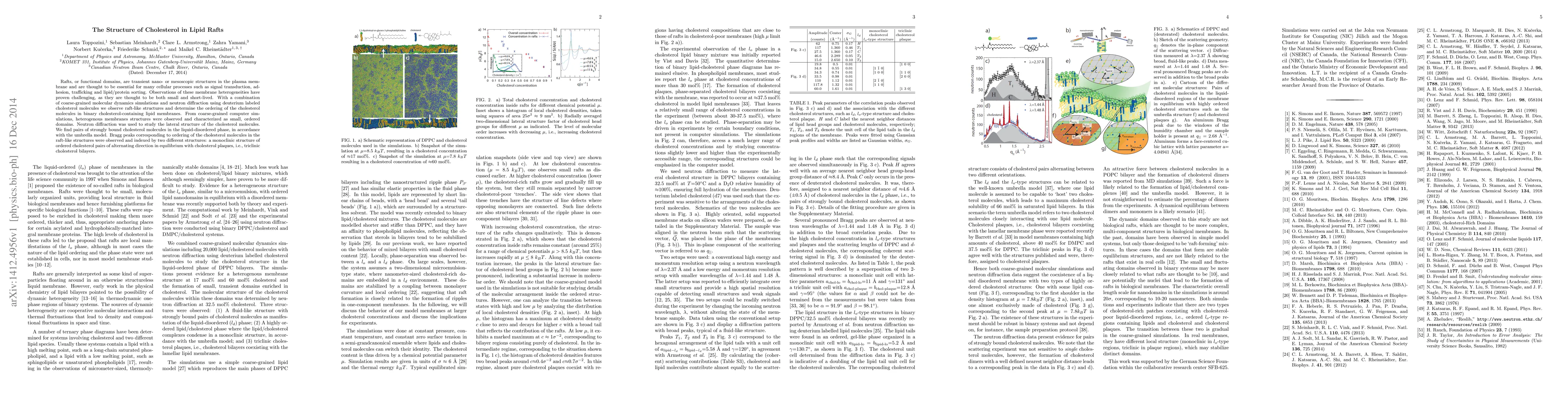 This study combines molecular dynamics simulations and neutron diffraction to investigate cholesterol organization in lipid rafts, revealing ordered pairs and plaques in the liquid-disordered phase, with a monoclinic structure of alternating cholesterol pairs and triclinic bilayers.