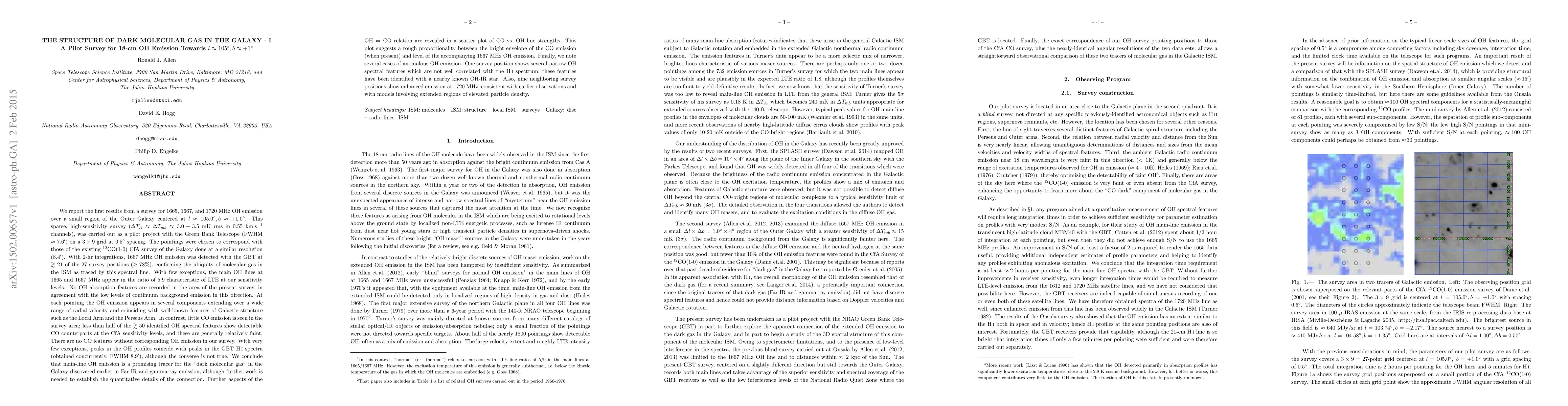 We report the first results from a survey for 1665, 1667, and 1720 MHz OH emission over a small region of the Outer Galaxy centered at $l \approx 105.0\deg , b \approx +1.0\deg$ . This sparse, high-sensitivity survey ($\Delta Ta \approx \Delta Tmb \approx 3.0 - 3.5$ mK rms in 0.55 km/s channels), was carried out as a pilot project with the Green Bank Telescope (GBT, FWHM $\approx 7.6'$) on a 3 X 9 grid at $0.5\deg$ spacing. The pointings chosen correspond with those of the existing $^{12}$CO(1-0) CfA survey of the Galaxy (FWHM $\approx 8.4'$). With 2-hr integrations, 1667 MHz OH emission was detected with the GBT at $\gtrsim 21$ of the 27 survey positions ($\geq 78\%$ ), confirming the ubiquity of molecular gas in the ISM as traced by this spectral line. With few exceptions, the main OH lines at 1665 and 1667 MHz appear in the ratio of 5:9 characteristic of LTE at our sensitivity levels. No OH absorption features are recorded in the area of the present survey, in agreement with the low levels of continuum background emission in this direction. At each pointing the OH emission appears in several components extending over a range of radial velocity and coinciding with well-known features of Galactic structure such as the Local Arm and the Perseus Arm. In contrast, little CO emission is seen in the survey area; less than half of the $\gtrsim 50$ identified OH components show detectable CO at the CfA sensitivity levels, and these are generally faint. There are no CO profiles without OH emission. With few exceptions, peaks in the OH profiles coincide with peaks in the GBT HI spectra (obtained concurrently, FWHM $8.9'$), although the converse is not true. We conclude that main-line OH emission is a promising tracer for the "dark molecular gas" in the Galaxy discovered earlier in Far-IR and gamma-ray emission. Further work is needed to establish the quantitative details of this connection.