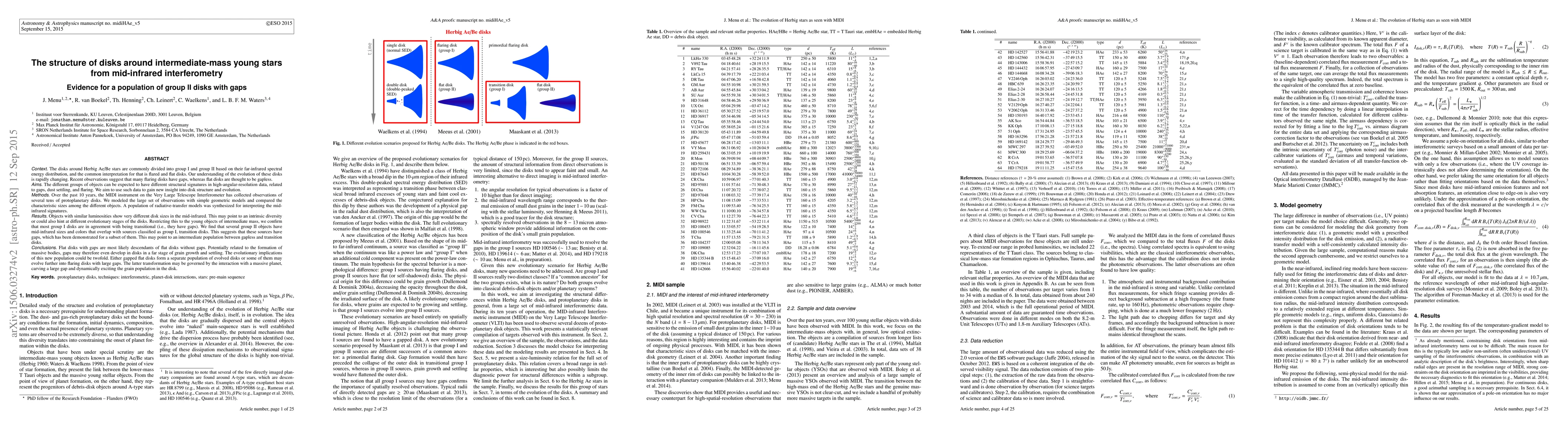 The disks around Herbig Ae/Be stars are commonly divided into group I and group II based on their far-infrared spectral energy distribution, and the common interpretation for that is flared and flat disks. Recent observations suggest that many flaring disks have gaps, whereas flat disks are thought to be gapless. The different groups of objects can be expected to have different structural signatures in high-angular-resolution data. Over the past 10 years, the MIDI instrument on the Very Large Telescope Interferometer has collected observations of several tens of protoplanetary disks. We model the large set of observations with simple geometric models. A population of radiative-transfer models is synthesized for interpreting the mid-infrared signatures. Objects with similar luminosities show very different disk sizes in the mid-infrared. Restricting to the young objects of intermediate mass, we confirm that most group I disks are in agreement with being transitional. We find that several group II objects have mid-infrared sizes and colors overlapping with sources classified as group I, transition disks. This suggests that these sources have gaps, which has been demonstrated for a subset of them. This may point to an intermediate population between gapless and transition disks. Flat disks with gaps are most likely descendants of flat disks without gaps. Gaps, potentially related to the formation of massive bodies, may therefore even develop in disks in a far stage of grain growth and settling. The evolutionary implications of this new population could be twofold. Either gapped flat disks form a separate population of evolved disks, or some of them may further evolve into flaring disks with large gaps. The latter transformation may be governed by the interaction with a massive planet, carving a large gap and dynamically exciting the grain population in the disk.