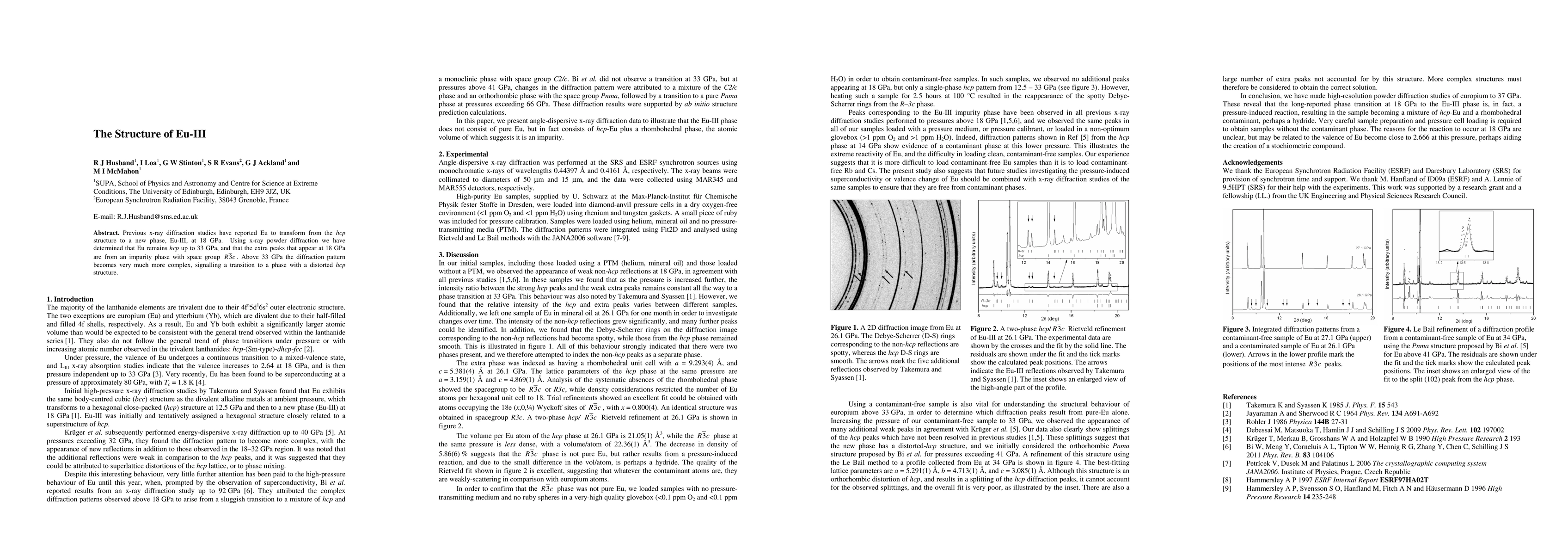 Previous x-ray diffraction studies have reported Eu to transform from the hcp structure to a new phase, Eu-III, at 18 GPa. Using x-ray powder diffraction we have determined that Eu remains hcp up to 33 GPa, and that the extra peaks that appear at 18 GPa are from an impurity phase with space group R-3c . Above 33 GPa the diffraction pattern becomes very much more complex, signalling a transition to a phase with a distorted hcp structure.