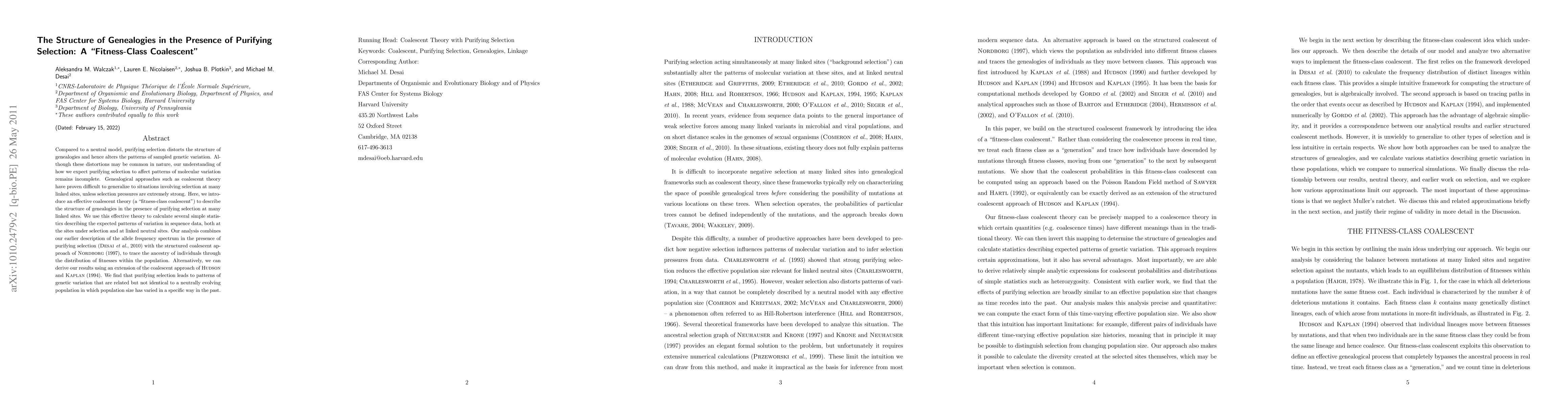 Compared to a neutral model, purifying selection distorts the structure of genealogies and hence alters the patterns of sampled genetic variation. Although these distortions may be common in nature, our understanding of how we expect purifying selection to affect patterns of molecular variation remains incomplete. Genealogical approaches such as coalescent theory have proven difficult to generalize to situations involving selection at many linked sites, unless selection pressures are extremely strong. Here, we introduce an effective coalescent theory (a "fitness-class coalescent") to describe the structure of genealogies in the presence of purifying selection at many linked sites. We use this effective theory to calculate several simple statistics describing the expected patterns of variation in sequence data, both at the sites under selection and at linked neutral sites. Our analysis combines our earlier description of the allele frequency spectrum in the presence of purifying selection (Desai et al. 2010) with the structured coalescent approach of Nordborg (1997), to trace the ancestry of individuals through the distribution of fitnesses within the population. Alternatively, we can derive our results using an extension of the coalescent approach of Hudson and Kaplan (1994). We find that purifying selection leads to patterns of genetic variation that are related but not identical to a neutrally evolving population in which population size has varied in a specific way in the past.