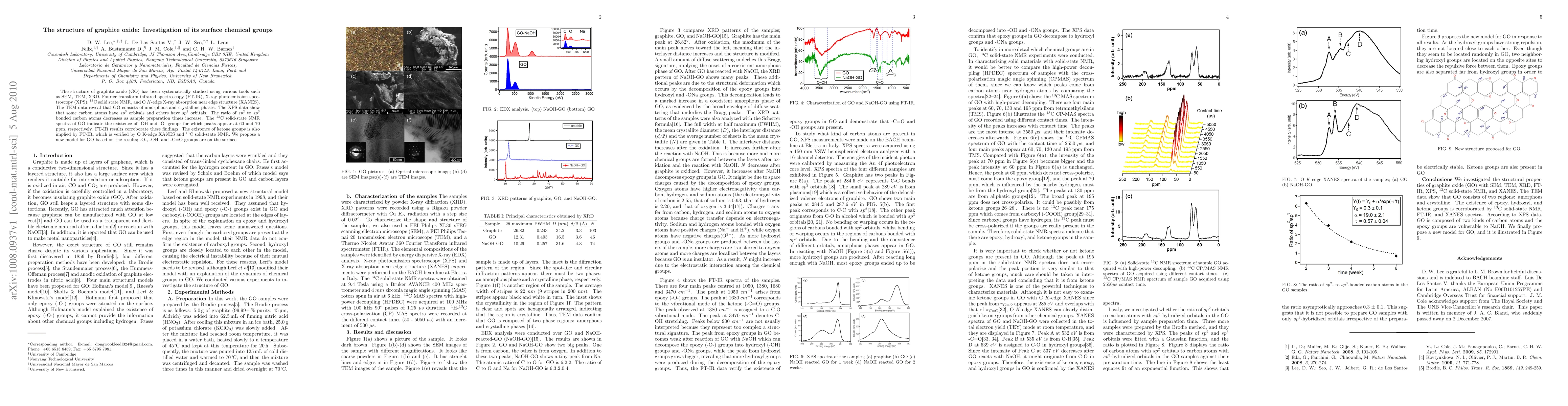 The structure of graphite oxide (GO) has been systematically studied using various tools such as SEM, TEM, XRD, Fourier transform infrared spectroscopy (FT-IR), X-ray photoemission spectroscopy (XPS), 13C solid state NMR, and O K-edge X-ray absorption near edge structure (XANES). The TEM data reveal that GO consists of amorphous and crystalline phases. The XPS data show that some carbon atoms have sp3 orbitals and others have sp2 orbitals. The ratio of sp2 to sp3 bonded carbon atoms decreases as sample preparation times increase. The 13C solid-state NMR spectra of GO indicate the existence of -OH and -O- groups for which peaks appear at 60 and 70 ppm, respectively. FT-IR results corroborate these findings. The existence of ketone groups is also implied by FT-IR, which is verified by O K-edge XANES and 13C solid-state NMR. We propose a new model for GO based on the results; -O-, -OH, and -C=O groups are on the surface.