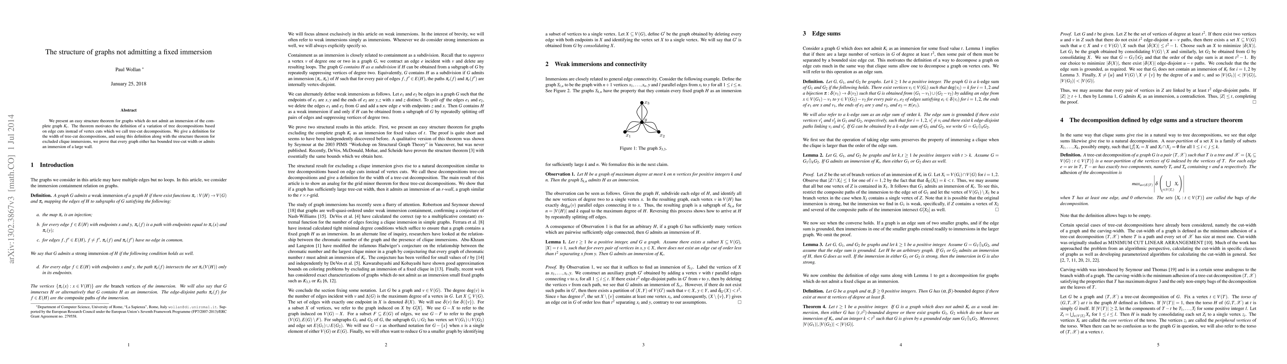 The research paper introduces a structure theorem for graphs that do not admit an immersion of the complete graph, showing that they either have bounded tree-cut width or admit an immersion of a large wall.