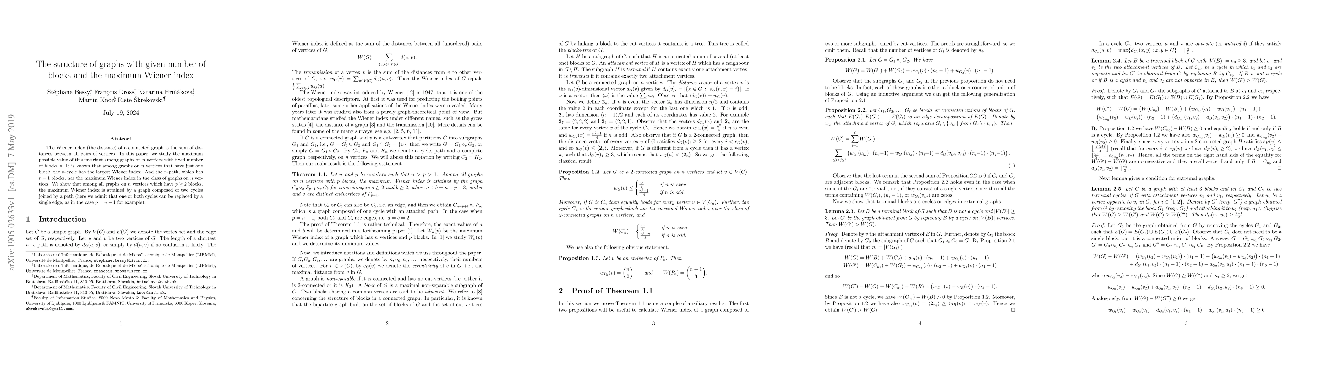 Summary: This paper investigates the maximum Wiener index among connected graphs on $n$ vertices with a fixed number of blocks $p$. It demonstrates that for $p \geq 2$, the graph composed of two cycles connected by a path achieves the highest Wiener index.