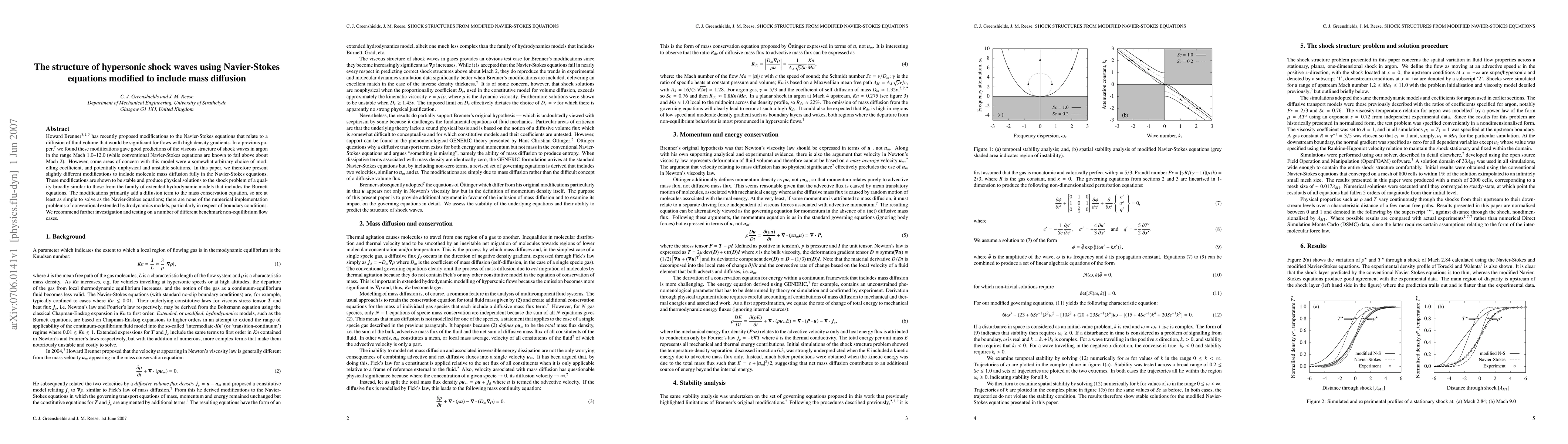 This paper proposes new modifications to the Navier-Stokes equations to include mass diffusion, addressing concerns from previous models that struggled with high-density gradients in hypersonic flows. The new modifications are shown to be stable and produce physically accurate shock wave predictions, comparable to extended hydrodynamic models.