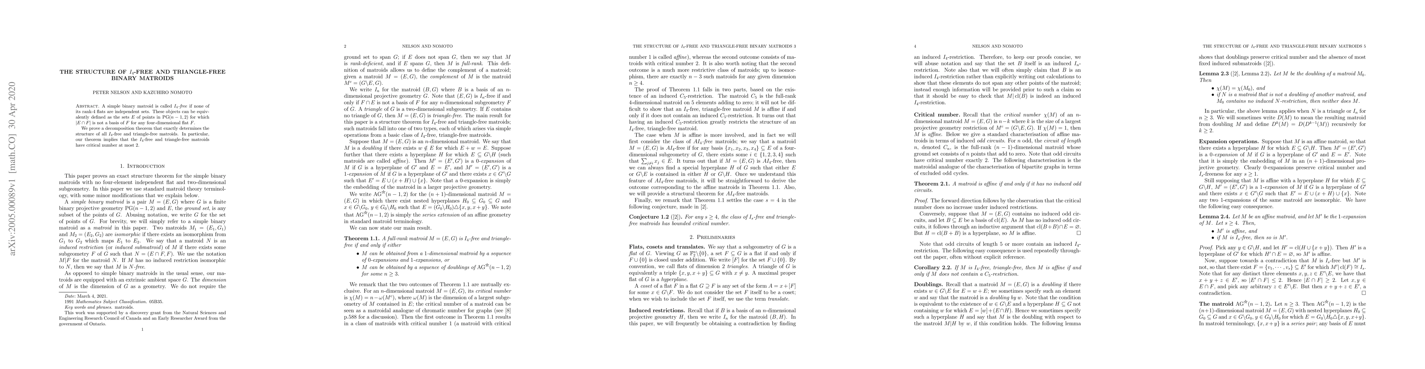 The paper provides a decomposition theorem that determines the structure of $I_4$-free and triangle-free binary matroids, showing they have critical number at most 2.
