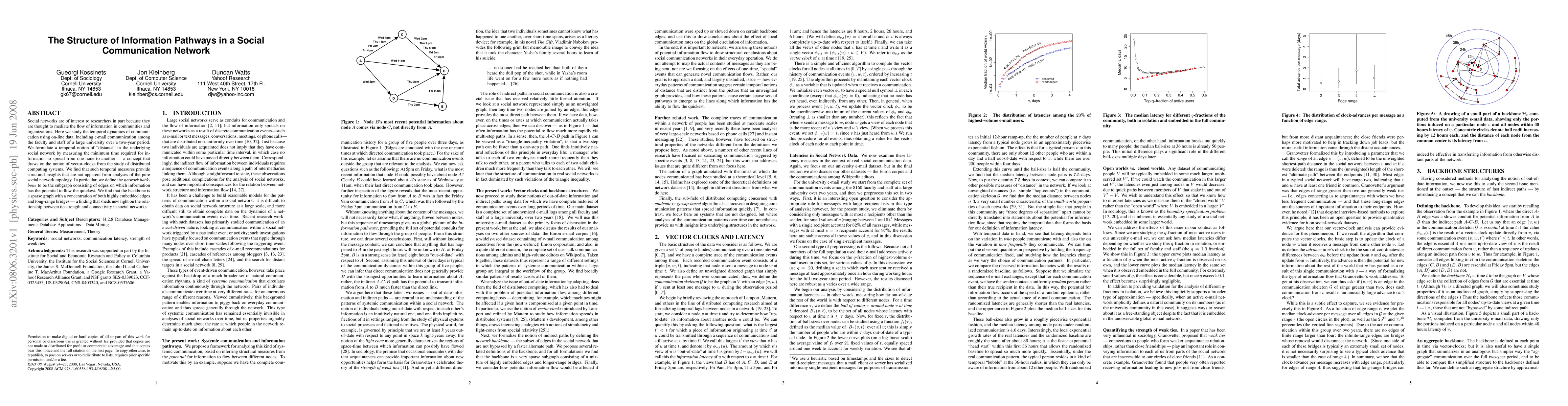 Social networks are of interest to researchers in part because they are thought to mediate the flow of information in communities and organizations. Here we study the temporal dynamics of communication using on-line data, including e-mail communication among the faculty and staff of a large university over a two-year period. We formulate a temporal notion of "distance" in the underlying social network by measuring the minimum time required for information to spread from one node to another -- a concept that draws on the notion of vector-clocks from the study of distributed computing systems. We find that such temporal measures provide structural insights that are not apparent from analyses of the pure social network topology. In particular, we define the network backbone to be the subgraph consisting of edges on which information has the potential to flow the quickest. We find that the backbone is a sparse graph with a concentration of both highly embedded edges and long-range bridges -- a finding that sheds new light on the relationship between tie strength and connectivity in social networks.
