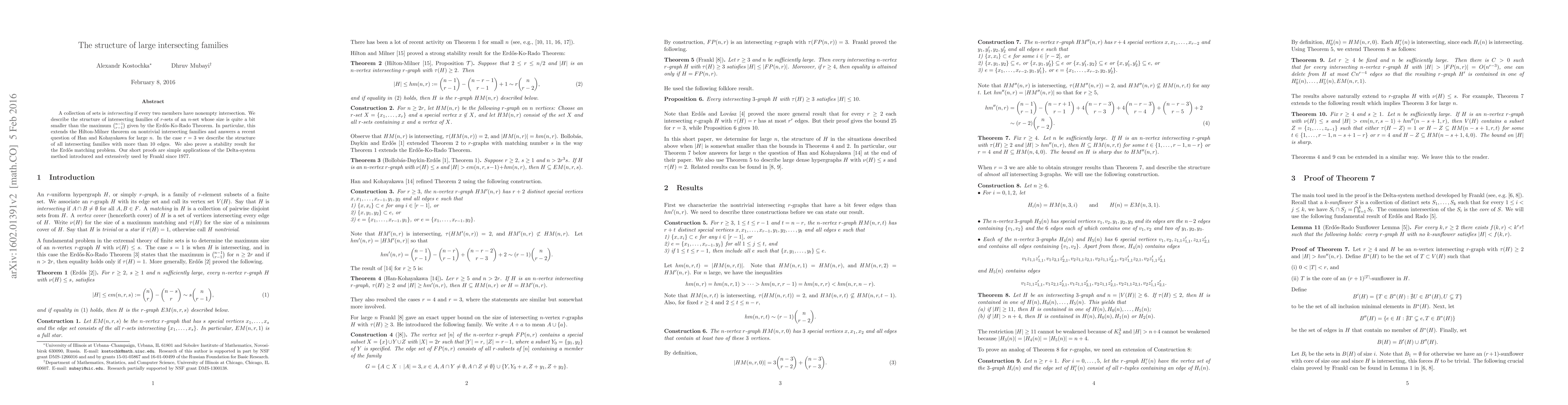A collection of sets is {\em intersecting} if every two members have nonempty intersection. We describe the structure of intersecting families of $r$-sets of an $n$-set whose size is quite a bit smaller than the maximum ${n-1 \choose r-1}$ given by the Erd\H os-Ko-Rado Theorem. In particular, this extends the Hilton-Milner theorem on nontrivial intersecting families and answers a recent question of Han and Kohayakawa for large $n$. In the case $r=3$ we describe the structure of all intersecting families with more than 10 edges. We also prove a stability result for the Erdos matching problem. Our short proofs are simple applications of the Delta-system method introduced and extensively used by Frankl since 1977.