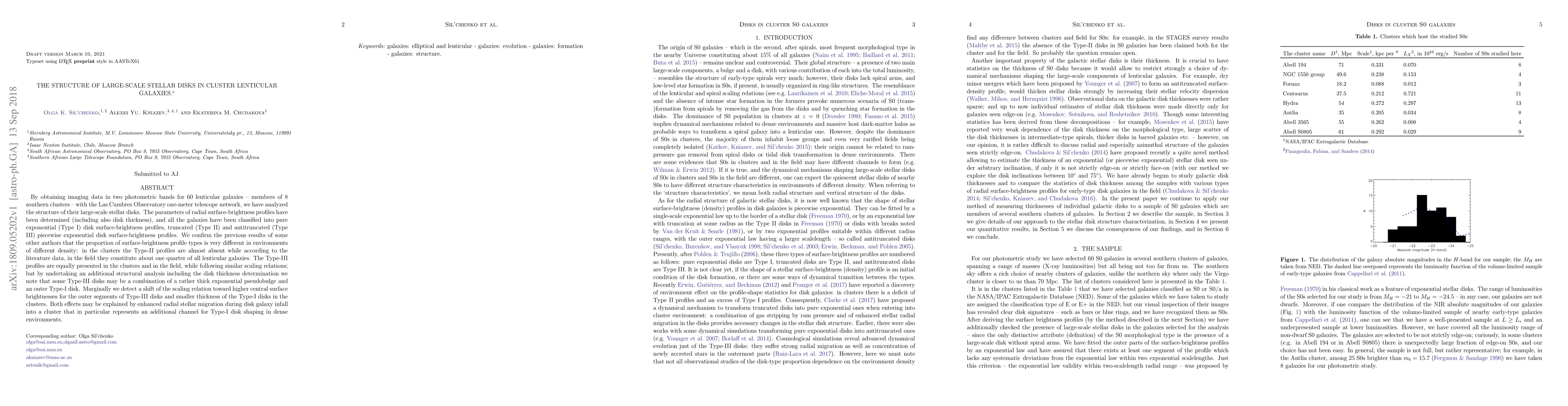 By obtaining imaging data in two photometric bands for 60 lenticular galaxies - members of 8 southern clusters - with the Las Cumbres Observatory one-meter telescope network, we have analyzed the structure of their large-scale stellar disks. The parameters of radial surface-brightness profiles have been determined (including also disk thickness), and all the galaxies have been classified into pure exponential (Type I) disk surface-brightness profiles, truncated (Type II) and antitruncated (Type III) piecewise exponential disk surface-brightness profiles. We confirm the previous results of some other authors that the proportion of surface-brightness profile types is very different in environments of different density: in the clusters the Type-II profiles are almost absent while according to the literature data, in the field they constitute about one quarter of all lenticular galaxies. The Type-III profiles are equally presented in the clusters and in the field, while following similar scaling relations; but by undertaking an additional structural analysis including the disk thickness determination we note that some Type-III disks may be a combination of a rather thick exponential pseudobulge and an outer Type-I disk. Marginally we detect a shift of the scaling relation toward higher central surface brightnesses for the outer segments of Type-III disks and smaller thickness of the Type-I disks in the clusters. Both effects may be explained by enhanced radial stellar migration during disk galaxy infall into a cluster that in particular represents an additional channel for Type-I disk shaping in dense environments.