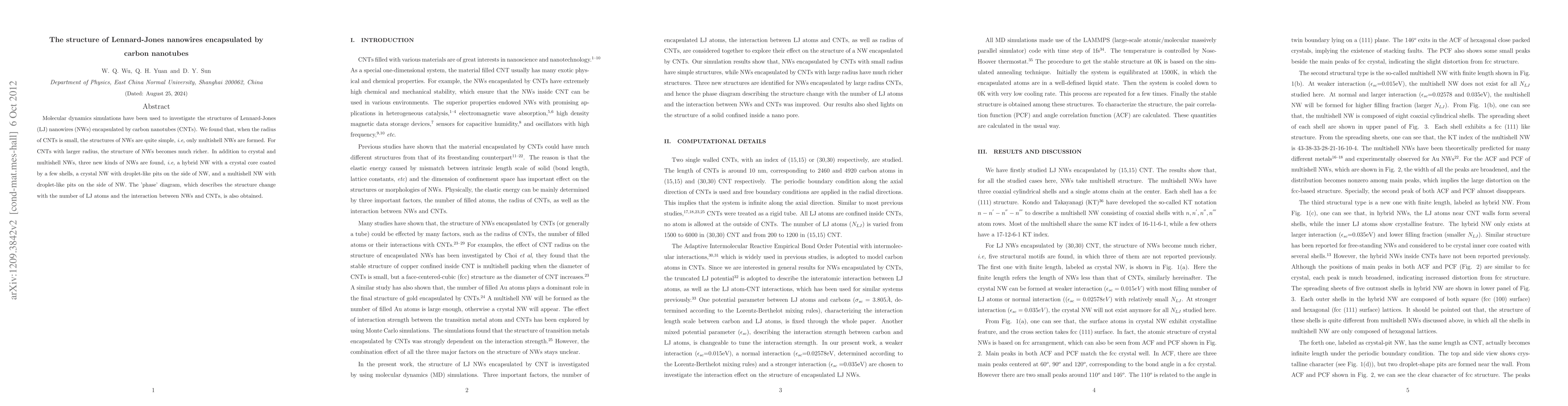 Molecular dynamics simulations reveal that the structure of Lennard-Jones nanowires encapsulated by carbon nanotubes varies significantly with the tube's radius, leading to simple multishell formations for small tubes and more complex structures including hybrid, pitted crystal, and pitted multishell NWs for larger tubes. A comprehensive 'phase' diagram illustrates these structural changes.