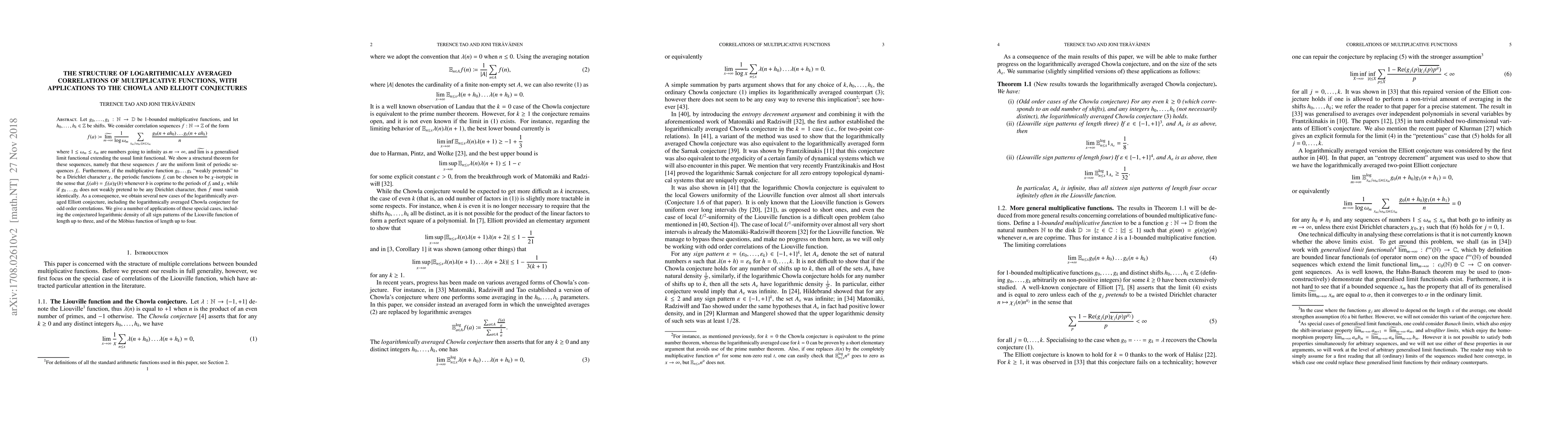 This paper establishes a structural theorem for logarithmically averaged correlations of multiplicative functions, showing they converge to periodic sequences. It also proves new cases of the logarithmically averaged Elliott and Chowla conjectures, including the density of sign patterns for the Liouville and M\"obius functions.