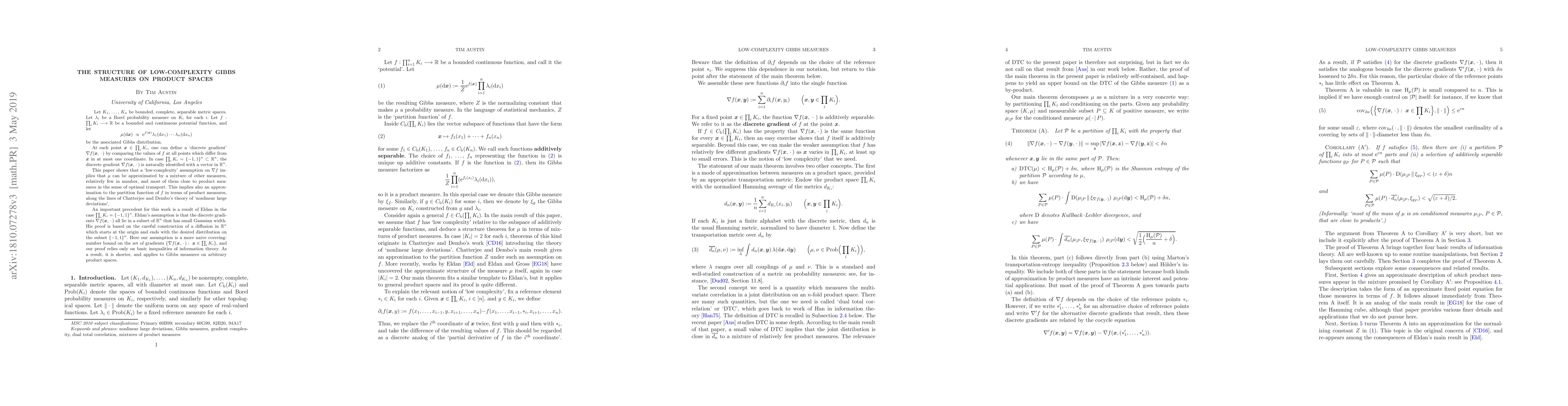 Let $K_1$, $\dots$, $K_n$ be bounded, complete, separable metric spaces. Let $\lambda_i$ be a Borel probability measure on $K_i$ for each $i$. Let $f:\prod_i K_i \to \mathbb{R}$ be a bounded and continuous potential function, and let $$\mu(d \mathbf{x})\ \propto\ e^{f(\mathbf{x})}\lambda_1(d x_1)\cdots \lambda_n(d x_n)$$ be the associated Gibbs distribution. At each point $\mathbf{x} \in \prod_i K_i$, one can define a `discrete gradient' $\nabla f(\mathbf{x},\,\cdot\,)$ by comparing the values of $f$ at all points which differ from $\mathbf{x}$ in at most one coordinate. In case $\prod_i K_i = \{-1,1\}^n \subset \mathbb{R}^n$, the discrete gradient $\nabla f(\mathbf{x},\,\cdot\,)$ is naturally identified with a vector in $\mathbb{R}^n$. This paper shows that a `low-complexity' assumption on $\nabla f$ implies that $\mu$ can be approximated by a mixture of other measures, relatively few in number, and most of them close to product measures in the sense of optimal transport. This implies also an approximation to the partition function of $f$ in terms of product measures, along the lines of Chatterjee and Dembo's theory of `nonlinear large deviations'. An important precedent for this work is a result of Eldan in the case $\prod_i K_i = \{-1,1\}^n$. Eldan's assumption is that the discrete gradients $\nabla f(\mathbf{x},\,\cdot\,)$ all lie in a subset of $\mathbb{R}^n$ that has small Gaussian width. His proof is based on the careful construction of a diffusion in $\mathbb{R}^n$ which starts at the origin and ends with the desired distribution on the subset $\{-1,1\}^n$. Here our assumption is a more naive covering-number bound on the set of gradients $\{\nabla f(\mathbf{x},\,\cdot\,):\ \mathbf{x} \in \prod_i K_i\}$, and our proof relies only on basic inequalities of information theory. As a result, it is shorter, and applies to Gibbs measures on arbitrary product spaces.