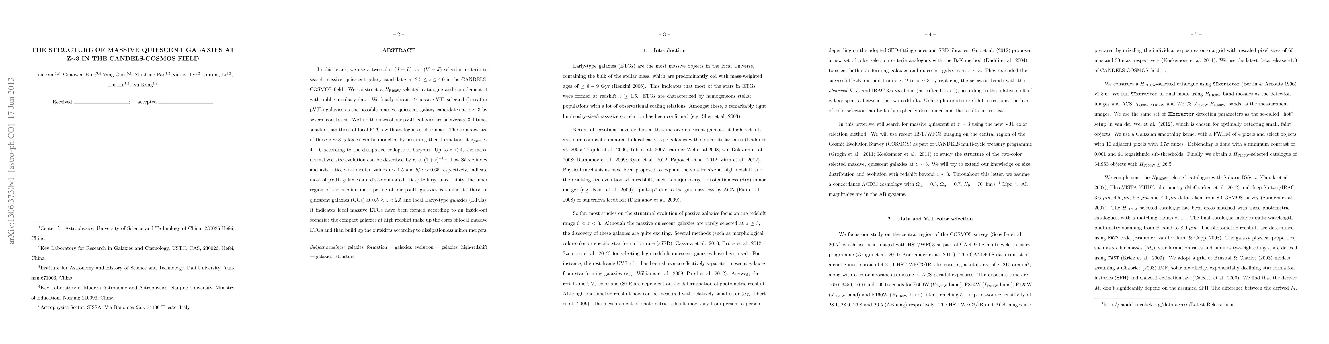 This paper identifies 19 massive, quiescent galaxies at z~3 using a two-color selection method in the CANDELS-COSMOS field. These galaxies are found to be compact, with sizes 3-4 times smaller than local early-type galaxies of similar mass, suggesting they formed via dissipative collapse at z~4-6.