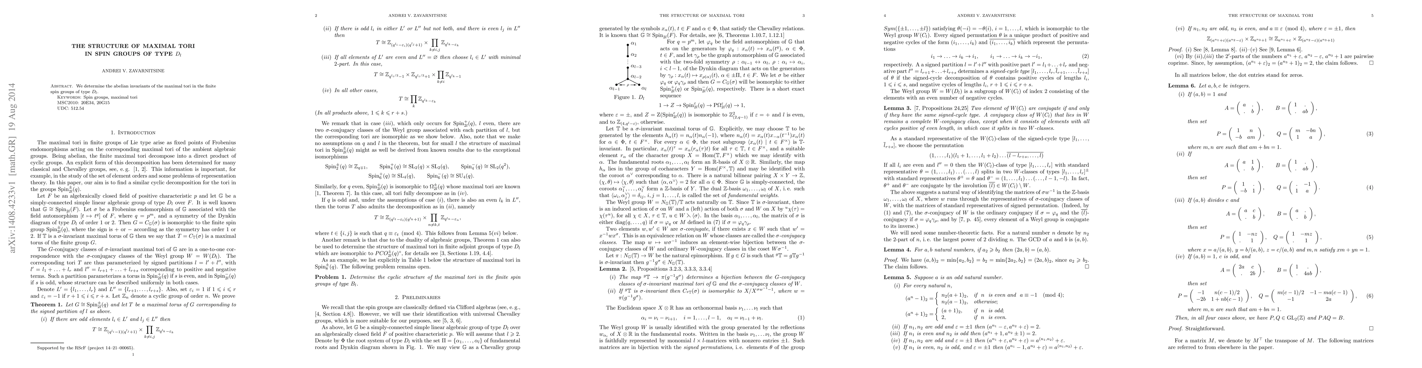 This paper identifies the abelian invariants that characterize the maximal tori within finite spin groups of type $D_l$, contributing to the understanding of their structure. The findings provide essential insights into the classification and properties of these algebraic groups.