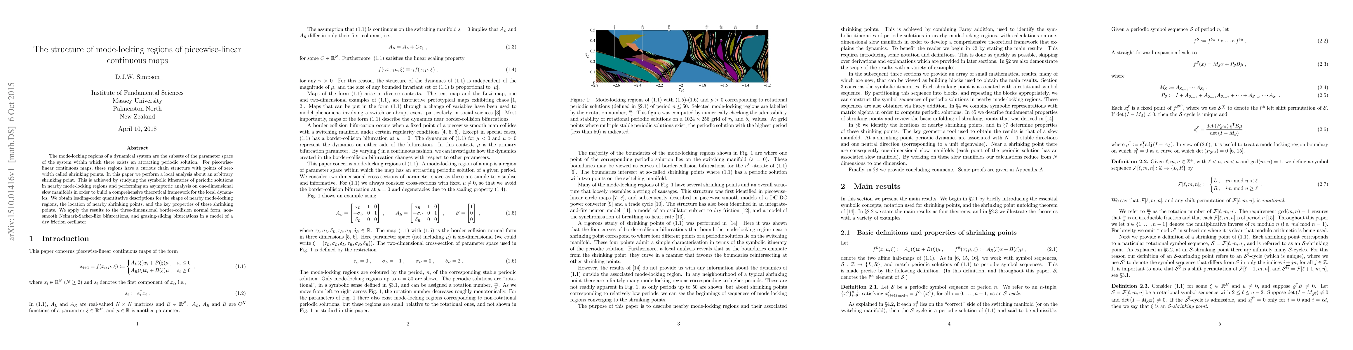 The mode-locking regions of a dynamical system are the subsets of the parameter space of the system within which there exists an attracting periodic solution. For piecewise-linear continuous maps, these regions have a curious chain structure with points of zero width called shrinking points. In this paper we perform a local analysis about an arbitrary shrinking point. This is achieved by studying the symbolic itineraries of periodic solutions in nearby mode-locking regions and performing an asymptotic analysis on one-dimensional slow manifolds in order to build a comprehensive theoretical framework for the local dynamics. We obtain leading-order quantitative descriptions for the shape of nearby mode-locking regions, the location of nearby shrinking points, and the key properties of these shrinking points. We apply the results to the three-dimensional border-collision normal form, nonsmooth Neimark-Sacker-like bifurcations, and grazing-sliding bifurcations in a model of a dry friction oscillator.