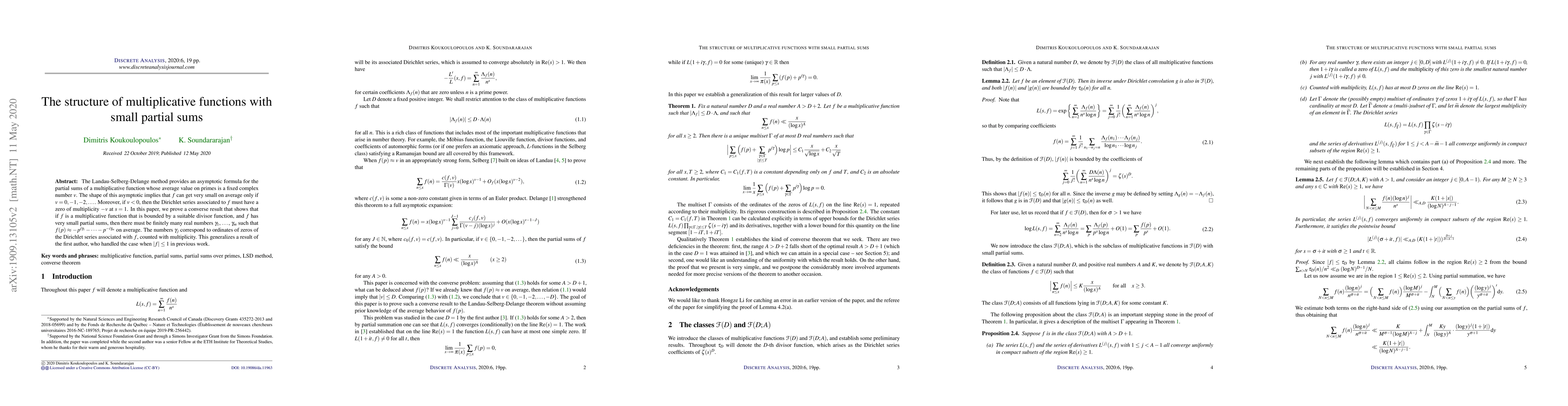 The Landau-Selberg-Delange method provides an asymptotic formula for the partial sums of a multiplicative function whose average value on primes is a fixed complex number $v$. The shape of this asymptotic implies that $f$ can get very small on average only if $v=0,-1,-2,\dots$. Moreover, if $v<0$, then the Dirichlet series associated to $f$ must have a zero of multiplicity $-v$ at $s=1$. In this paper, we prove a converse result that shows that if $f$ is a multiplicative function that is bounded by a suitable divisor function, and $f$ has very small partial sums, then there must be finitely many real numbers $\gamma_1$, $\dots$, $\gamma_m$ such that $f(p)\approx -p^{i\gamma_1}-\cdots-p^{-i\gamma_m}$ on average. The numbers $\gamma_j$ correspond to ordinates of zeroes of the Dirichlet series associated to $f$, counted with multiplicity. This generalizes a result of the first author, who handled the case when $|f|\le 1$ in previous work.
