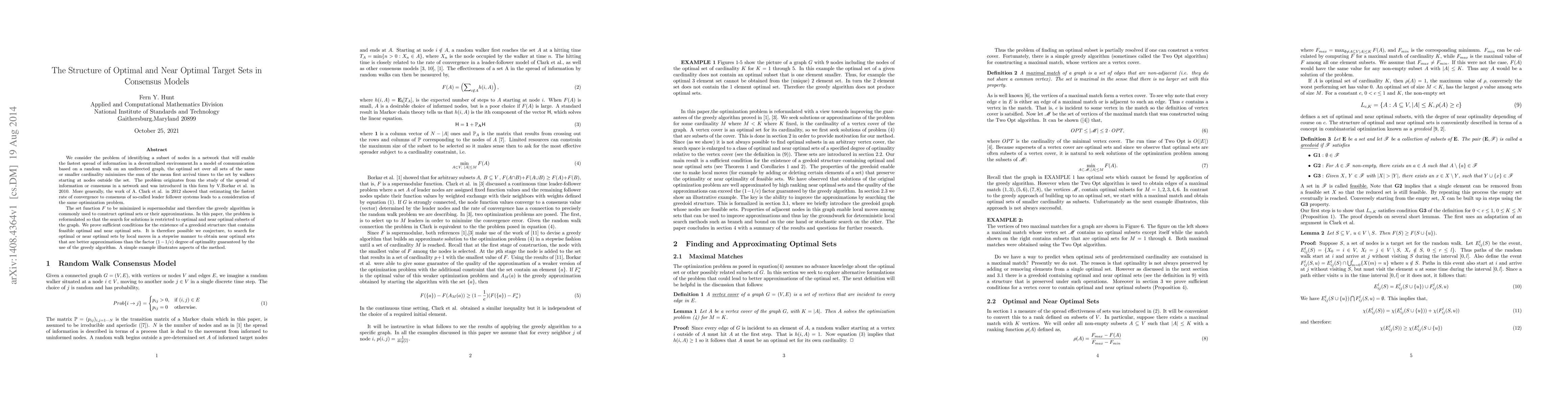 We consider the problem of identifying a subset of nodes in a network that will enable the fastest spread of information in a decentralized environment.In a model of communication based on a random walk on an undirected graph, the optimal set over all sets of the same or smaller cardinality minimizes the sum of the mean first arrival times to the set by walkers starting at nodes outside the set. The problem originates from the study of the spread of information or consensus in a network and was introduced in this form by V.Borkar et al. in 2010. More generally, the work of A. Clark et al. in 2012 showed that estimating the fastest rate of convergence to consensus of so-called leader follower systems leads to a consideration of the same optimization problem. The set function $F$ to be minimized is supermodular and therefore the greedy algorithm is commonly used to construct optimal sets or their approximations. In this paper, the problem is reformulated so that the search for solutions is restricted to optimal and near optimal subsets of the graph. We prove sufficient conditions for the existence of a greedoid structure that contains feasible optimal and near optimal sets. It is therefore possible we conjecture, to search for optimal or near optimal sets by local moves in a stepwise manner to obtain near optimal sets that are better approximations than the factor $(1-1/e)$ degree of optimality guaranteed by the use of the greedy algorithm. A simple example illustrates aspects of the method.