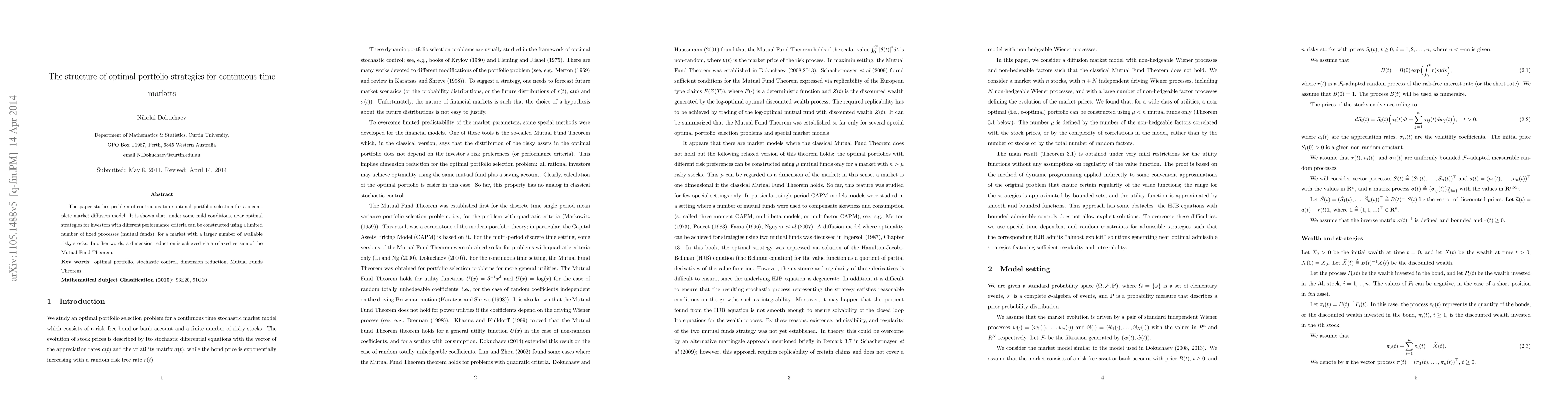 The paper explores optimal portfolio strategies in continuous time incomplete markets, demonstrating that near-optimal strategies can be constructed using a limited number of fixed processes, thus achieving dimension reduction through a relaxed Mutual Fund Theorem.