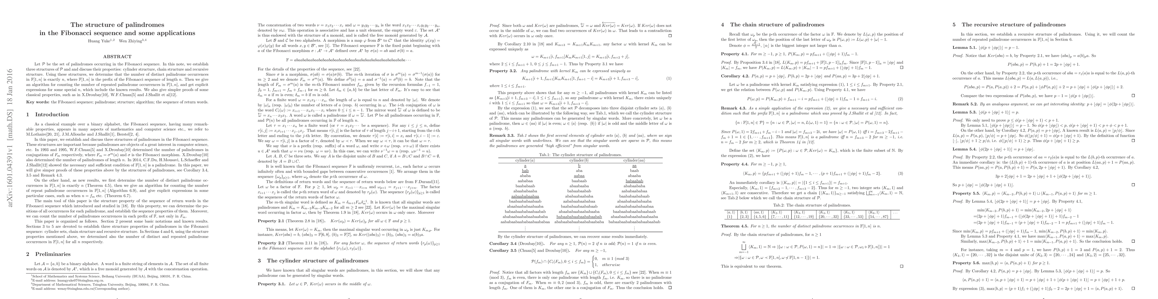 This paper identifies three structures of palindromes within the Fibonacci sequence—cylinder, chain, and recursive—and demonstrates that the number of distinct palindrome occurrences in the first $n$ terms of the Fibonacci sequence is exactly $n$. It also provides an algorithm for counting repeated palindrome occurrences and offers simplified proofs of classical properties.