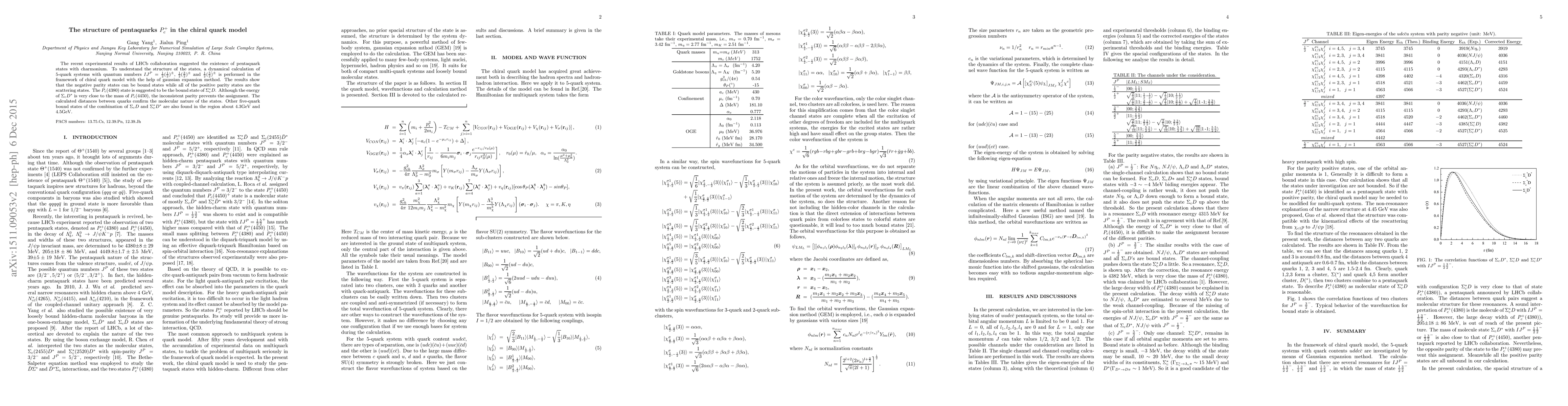 This study uses the chiral quark model to investigate pentaquark states $P_c^+$, revealing that negative parity states can form bound states while positive parity states are scattering states. The $P_c(4380)$ state is identified as a bound state of $\Sigma^*_cD$, confirming its molecular nature.