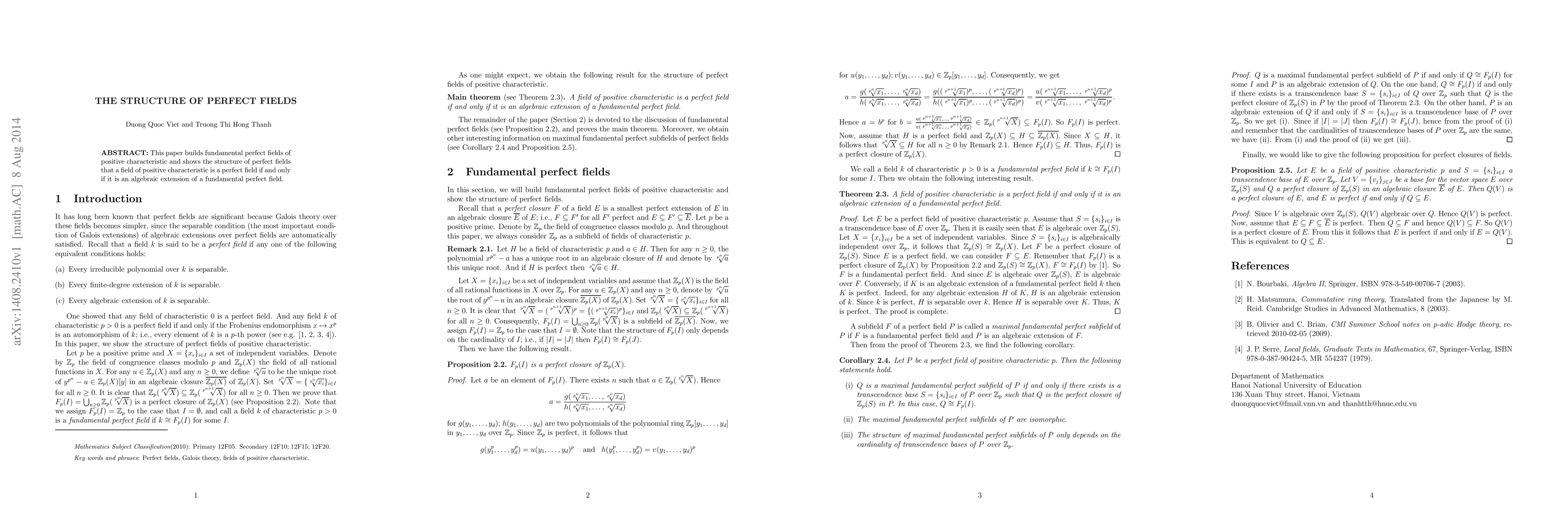This paper builds fundamental perfect fields of positive characteristic and shows the structure of perfect fields that a field of positive characteristic is a perfect field if and only if it is an algebraic extension of a fundamental perfect field.