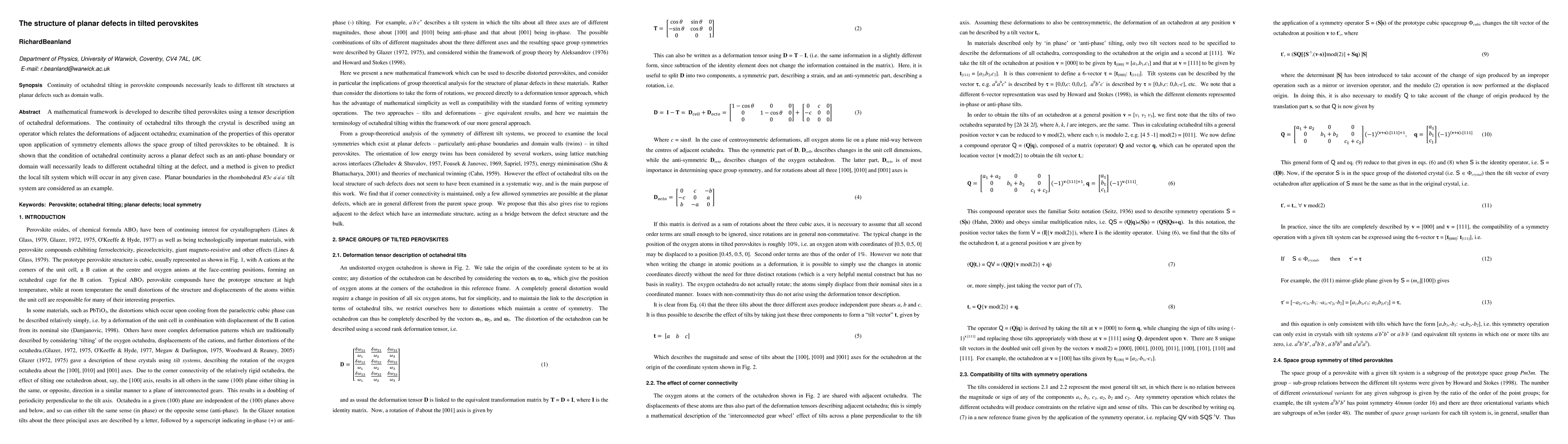 A mathematical framework is developed to describe tilted perovskites using a tensor description of octahedral deformations. The continuity of octahedral tilts through the crystal is described using an operator which relates the deformations of adjacent octahedra; examination of the properties of this operator upon application of symmetry elements allows the space group of tilted perovskites to be obtained. It is shown that the condition of octahedral continuity across a planar defect such as an anti-phase boundary or domain wall necessarily leads to different octahedral tilting at the defect, and a method is given to predict the local tilt system which will occur in any given case. Planar boundaries in the rhombohedral R3c a-a-a- tilt system are considered as an example.