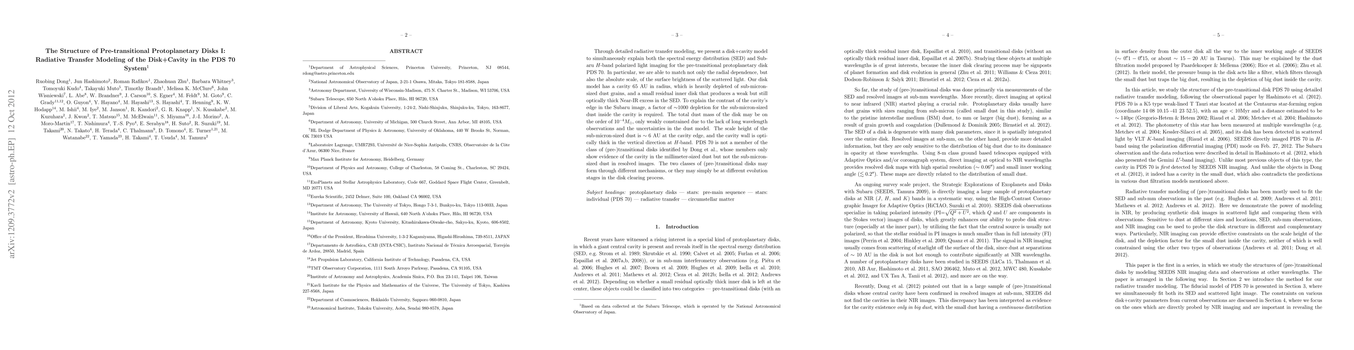 This paper uses radiative transfer modeling to describe the structure of the pre-transitional protoplanetary disk PDS 70, revealing a cavity depleted of sub-micron dust and a small inner disk producing NIR excess. The disk's total dust mass is estimated to be around 1e-4 M_sun, with significant differences from other (pre-)transitional disks.