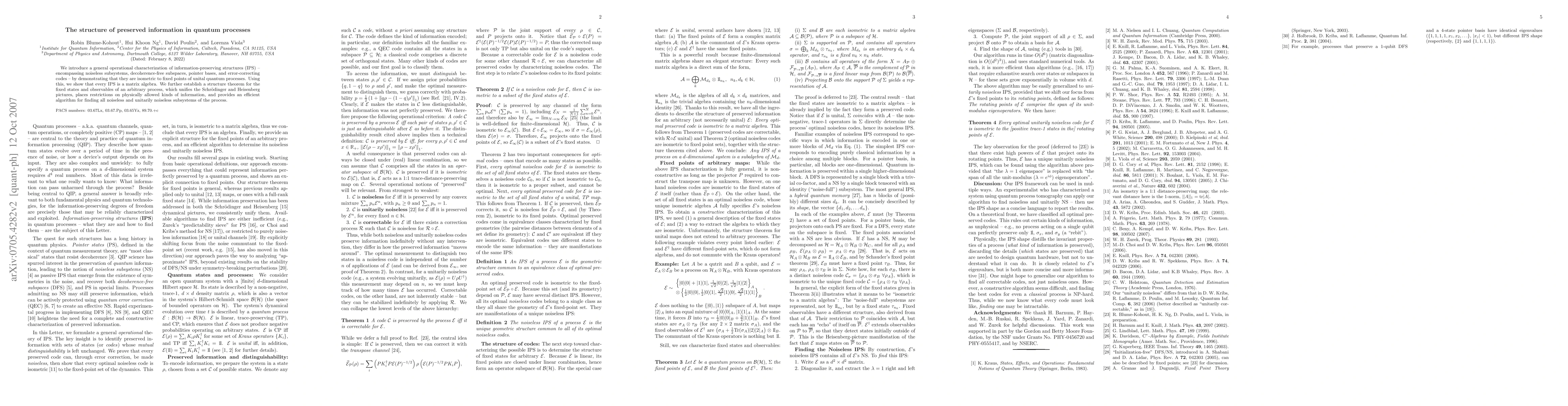 We introduce a general operational characterization of information-preserving structures (IPS) -- encompassing noiseless subsystems, decoherence-free subspaces, pointer bases, and error-correcting codes -- by demonstrating that they are isometric to fixed points of unital quantum processes. Using this, we show that every IPS is a matrix algebra. We further establish a structure theorem for the fixed states and observables of an arbitrary process, which unifies the Schrodinger and Heisenberg pictures, places restrictions on physically allowed kinds of information, and provides an efficient algorithm for finding all noiseless and unitarily noiseless subsystems of the process.