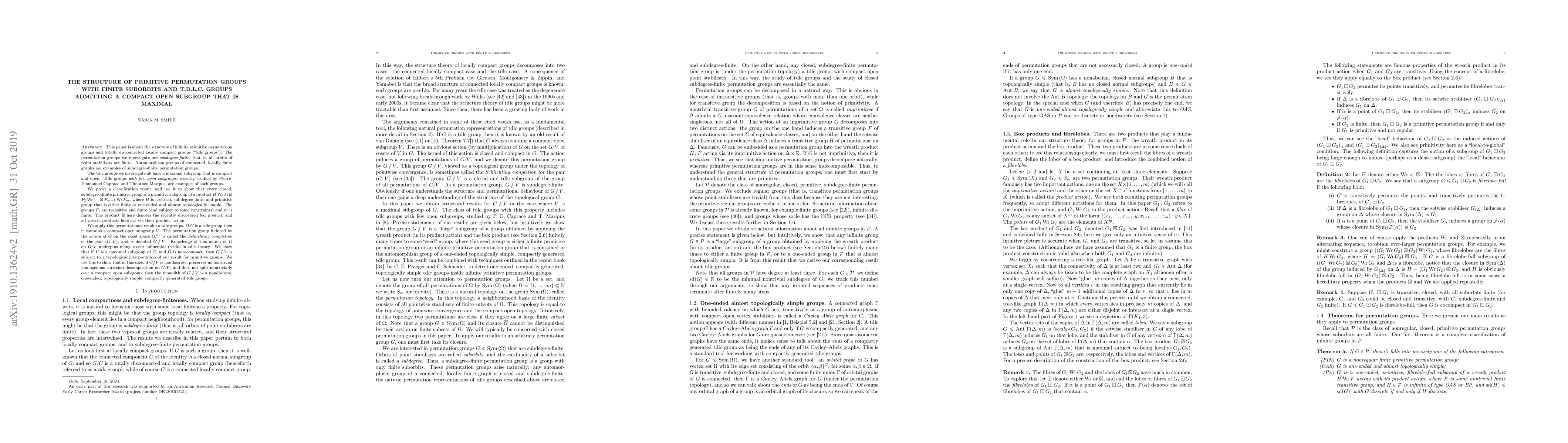 This paper is about the structure of infinite primitive permutation groups and totally disconnected locally compact groups ("tdlc groups'"). The permutation groups we investigate are subdegree-finite (i.e. all orbits of point stabilisers are finite). Automorphism groups of connected, locally finite graphs are examples of subdegree-finite permutation groups. The tdlc groups we investigate all have a maximal subgroup that is compact and open. Tdlc groups with few open subgroups (recently studied by Pierre-Emmanuel Caprace and Timoth\'ee Marquis) are examples of such groups. We prove a classification result, and use it to show that every closed, subdegree-finite primitive group is a primitive subgroup of a product H Wr F_1 [X] F_2 Wr ... [X] F_{m-1} Wr F_m, where H is a closed, subdegree-finite and primitive group that is either finite or one-ended and almost topologically simple. The groups F_i are transitive and finite and m is finite. The product [X] here denotes the recently discovered box product, and all wreath products here act via their product action. We apply this permutational result to tdlc groups. If G is a tdlc group then it contains a compact open subgroup V. The permutation group induced by the action of G on the coset space G/V is called the Schlichting completion of the pair (G,V), and is denoted G//V. Knowledge of this action of G on G/V underpins many recent influential results in tdlc theory. We show that if V is a maximal subgroup of G, and G is non-compact, then G//V is subject to a topological interpretation of our result for primitive groups. We use this to show that in this case, if G//V is nondiscrete, preserves no nontrivial homogenous cartesian decomposition on G/V, and does not split nontrivially over a compact open subgroup, then the monolith of G//V is a nondiscrete, one-ended, topologically simple, compactly generated tdlc group.